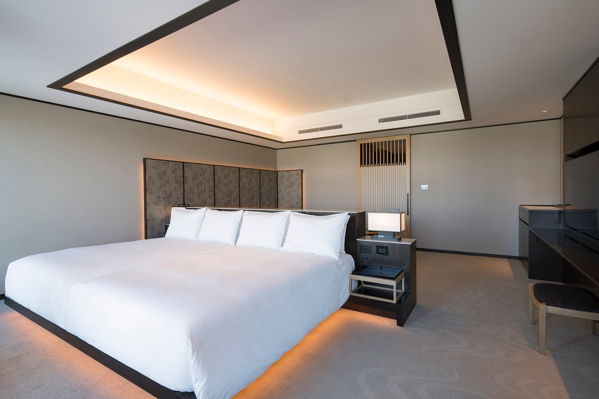 「滞在する美術館」として和のアートが随所に配され、全客室には「北斎漫画」の木版画を展示。