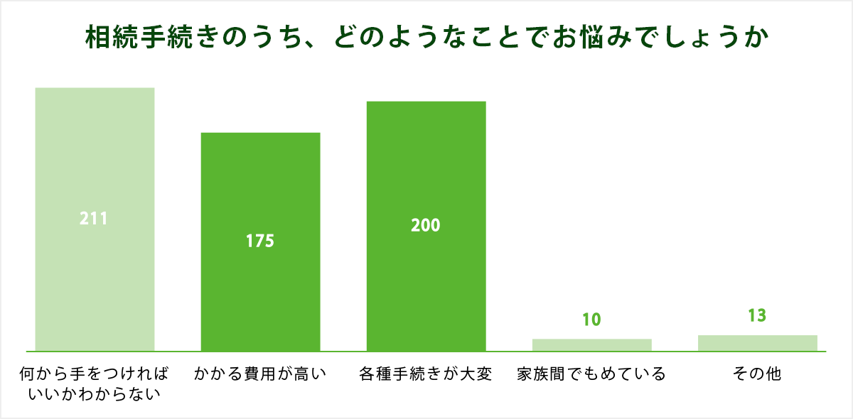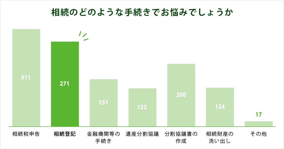 また辻・本郷 ITコンサルティング株式会社が実施したアンケート(※2)では、相続にあたって困る手続きとして「相続登記」を上げた人の割合が約67%、相続手続きにあたり困ることについて「何から手を付ければいいかわからない」と答えた人が約60%、「各種手続きが大変」と答えた人が約57%、「かかる費用が高い」と答えた人が50%にのぼりました。相続にあたって、相続登記が課題に上がりやすいことに加え、手続きの方法が分からない、もしくは手続きの負担が大きいことが明らかになっています。