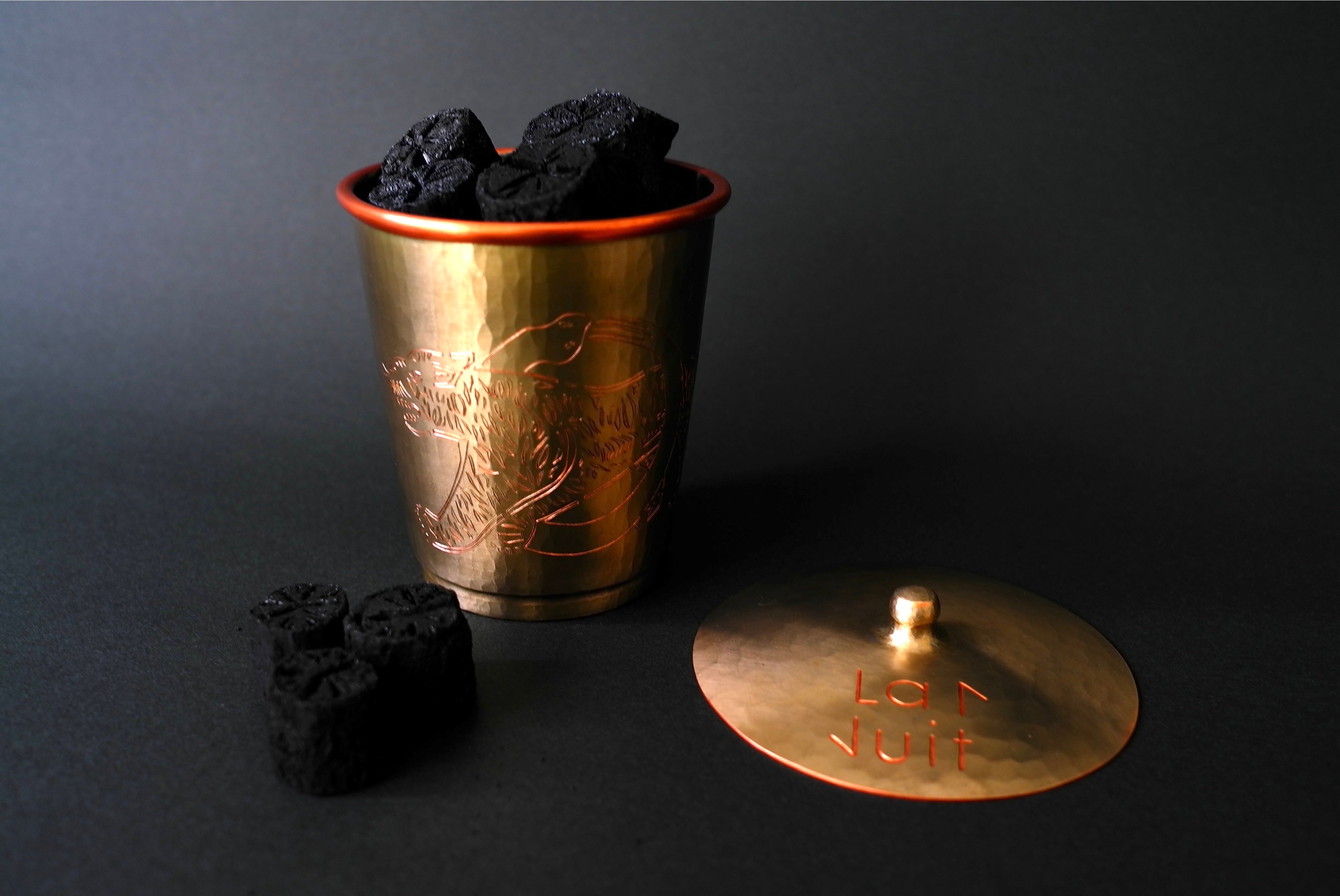 新潟・燕三条の伝統工芸、鎚起銅器(ついきどうき)によるコーヒーカップに菊炭を詰め、オリジナルのアロマオイルを垂らして使用。カップ前面に虎へび珈琲、蓋にラニュイのロゴを手彫りしたクラフト感あふれるデザインです。菊炭を取り除き、コーヒーカップとして使用することも可能です。