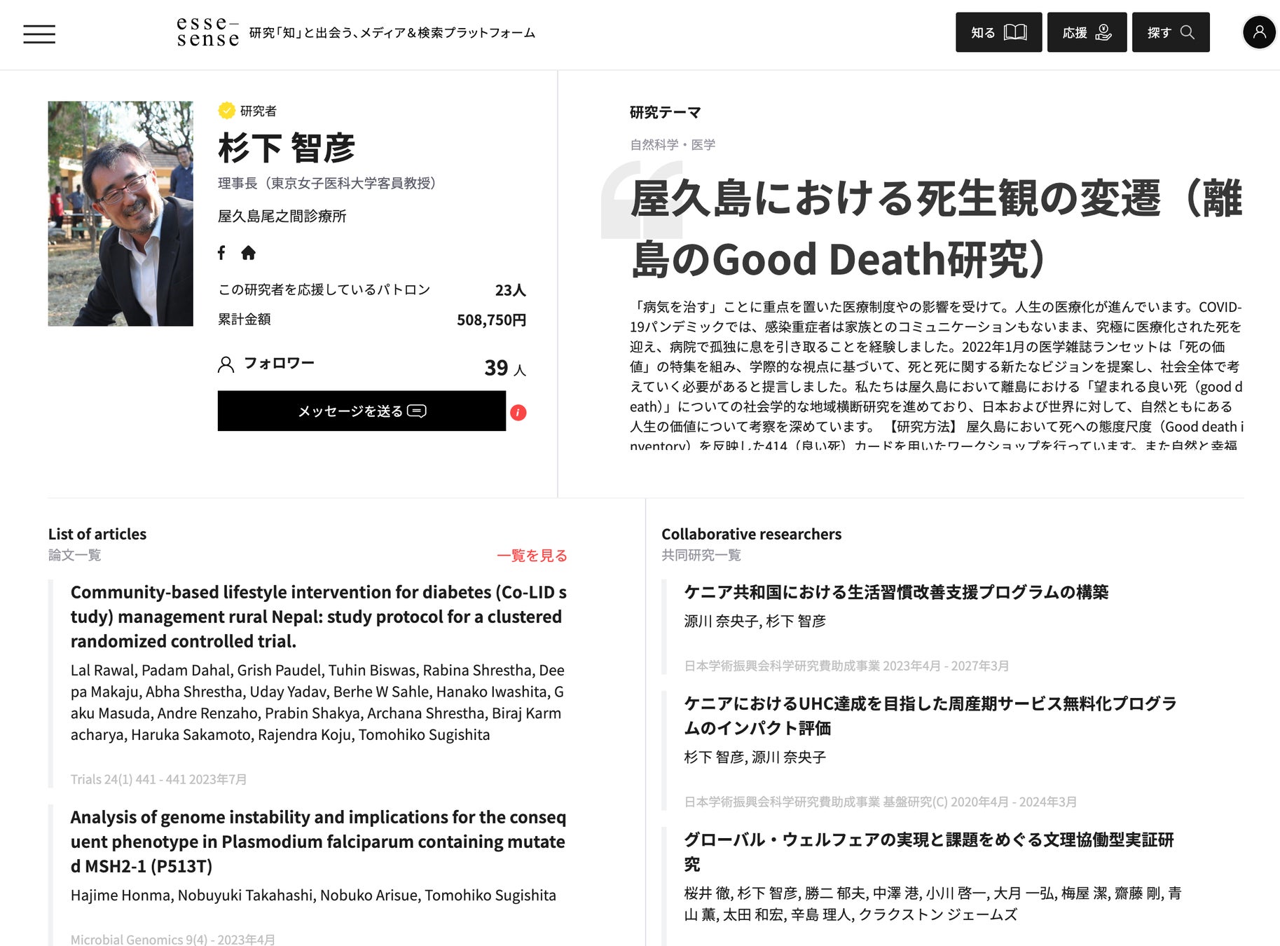 エッセンスは、研究者に特化したメディア・プラットフォームとして、研究者の登録認証の仕組みや研究者に特化したプロフィールページの生成など、研究者の存在を軸としたサービス構築を行ってきました。