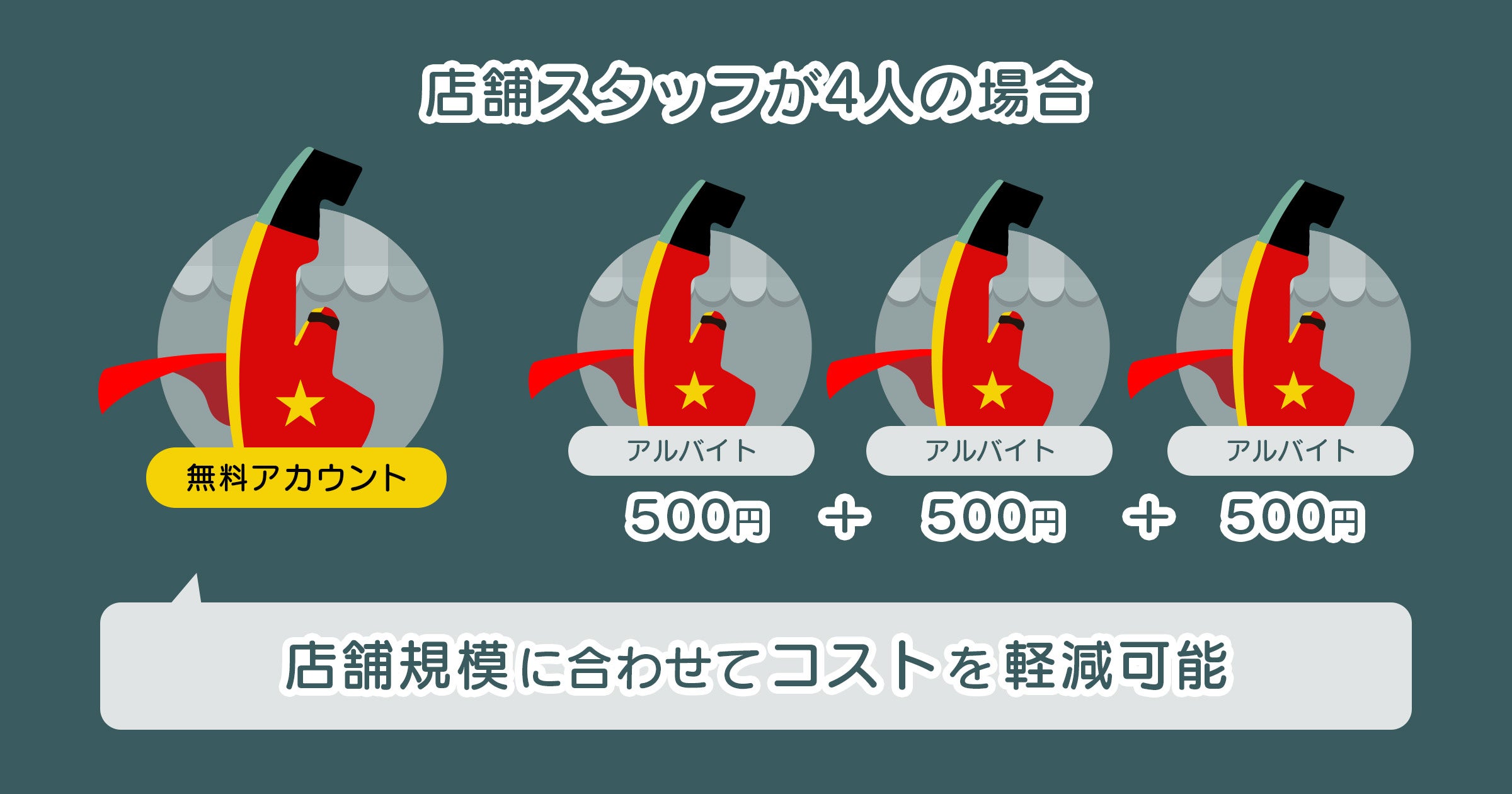 また、2人目以降のアカウントに関しても、すべての機能を月額500円(税別)にてご利用いただける、スタッフアカウントごとの課金システムなので、店舗規模に合わせてコストが削減できます。
