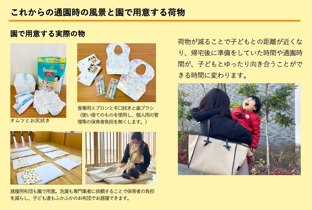 ■子どもとの時間を増やすための新サービスを提供/使用する荷物を園で用意する「荷物のいらない保育園」