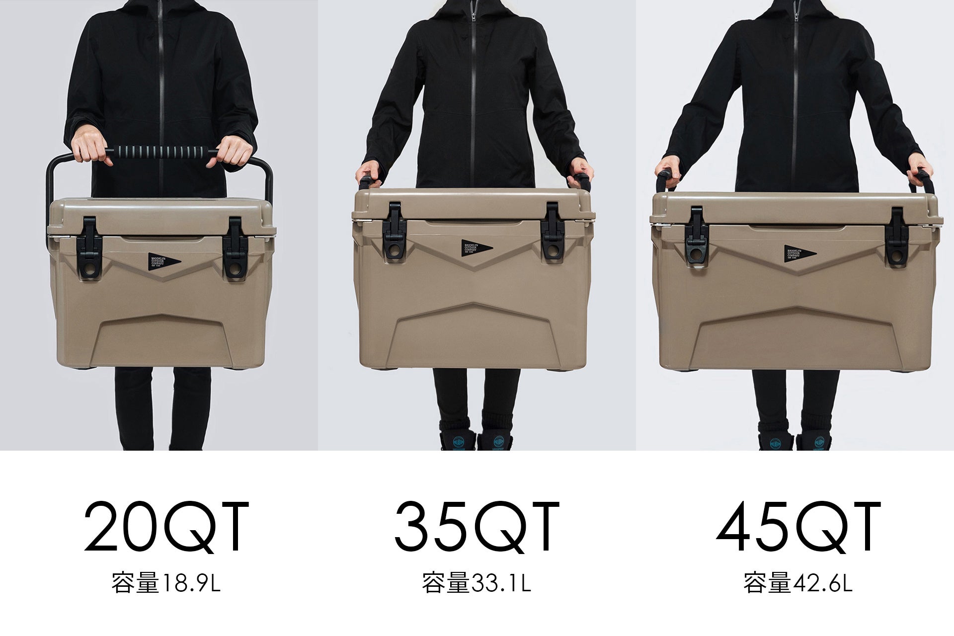 お馴染みのクーラーボックスをさらにグレードUPするべく従来の最大5cm厚ボディーを7.5cm厚で別注し、これまでの最長5日間(気候や開閉頻度によります)の保冷力にさらにプラスの安心を備えたクーラーボックスが誕生しました。断熱材が充填された最大7.5cm厚の強靭なボディーは、丈夫で安心の食品グレード素材による一体形成。紫外線にも強く劣化し難いのでアウトドアにも最適です。