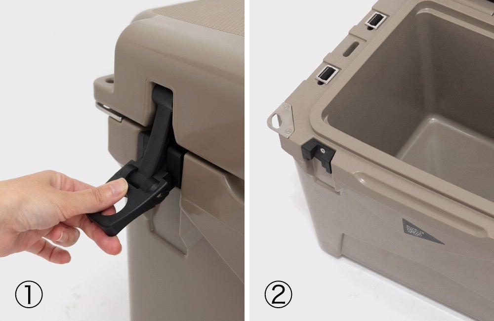 子供や女性でも楽に開閉できるラッチハンドルや冷蔵庫並みの密閉力を誇るパッキン、密閉により開かなくなった蓋を開けるための空気圧開放ボタンなど、クーラーボックスとして必要な装備をしっかり備えた安心の構造です。