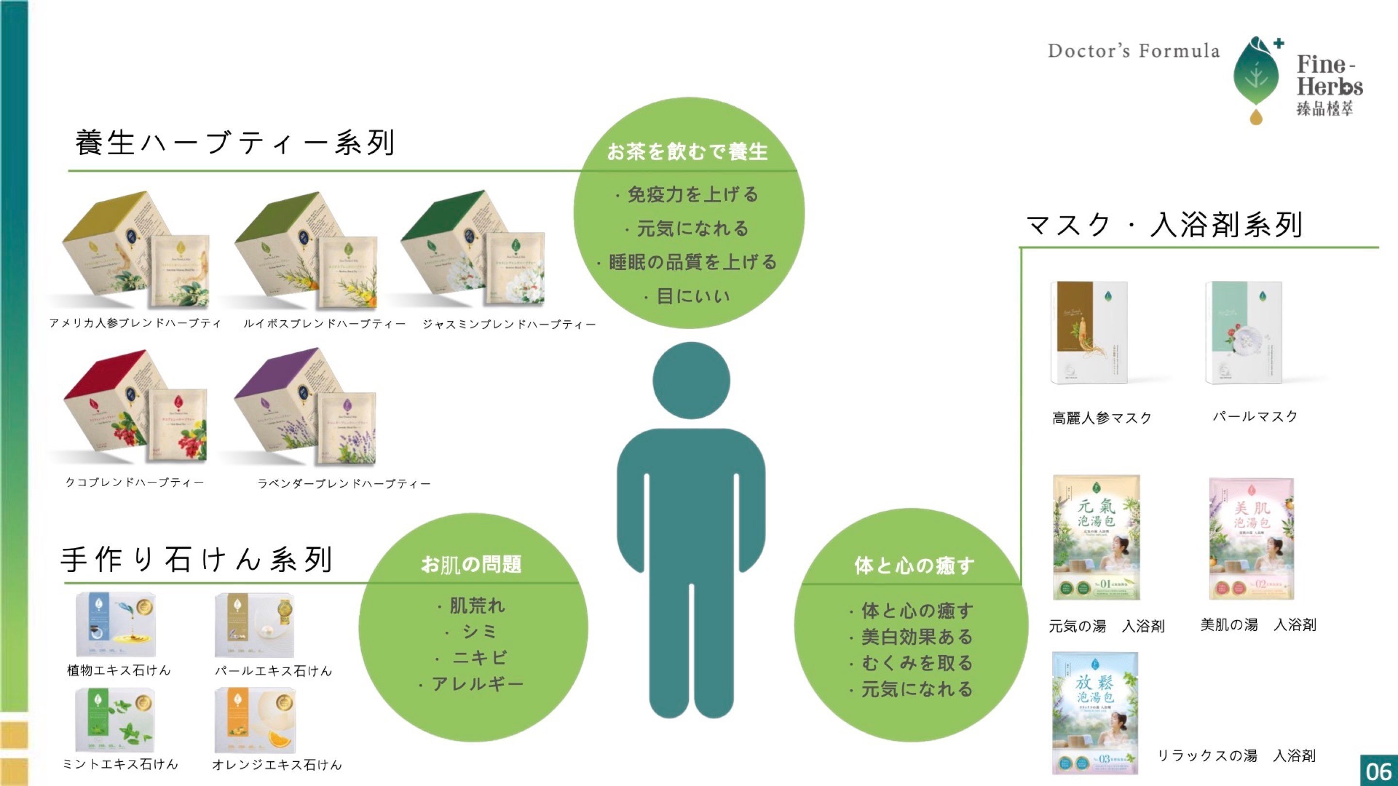 今年1月より日本での販売を開始したオリジナルブレンドハーブティーを中心に、今後の展開予定の漢方石鹸、フェイスマスク、入浴剤などの商品もご紹介させていただきます。