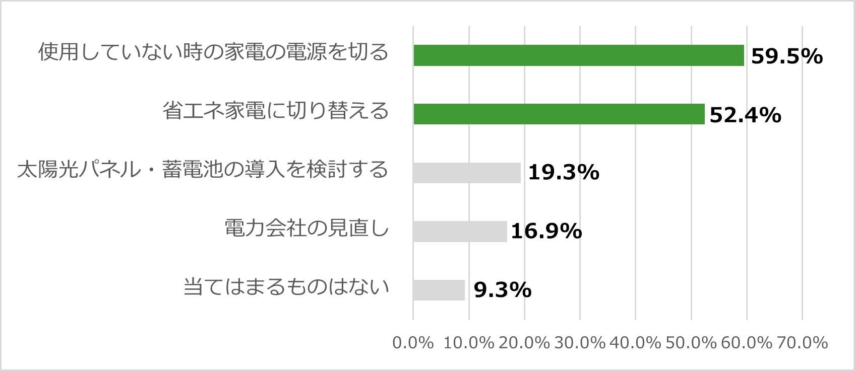 一方で、「太陽光パネル・蓄電池の導入を検討する」も第3位に挙がっており、約5人に1人は太陽光パネル・蓄電池の導入が電気代節約の方法になり得ると認識されていることが分かりました。