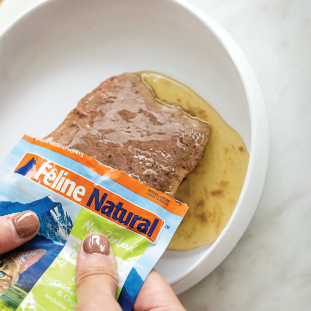 猫は、食肉目に分類される完全肉食の動物です。「Feline(フィーライン)ナチュラル プレミアムパウチ チキン&ラム・フィースト」は、水分を除く原材料の99%以上に、ニュージーランド産の鶏と子羊を使用しています。また、製品中の水分含有量は、約80%。より自然な形で、食事からたっぷりと良質な動物性タンパク質と水分が摂取出来ます。
