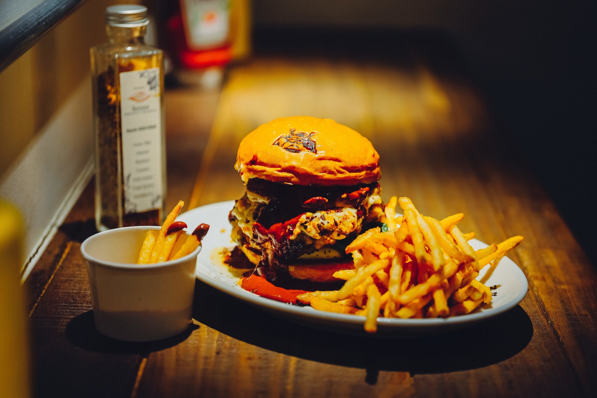お客様自身でかけたり、ポテトにディップしたりしてお楽しみいただけるハンバーガーです。