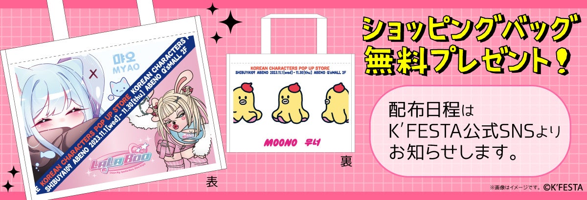 株式会社イントゥCorp.(本社:大阪市中央区)は韓国キャラクターの魅力が一堂に集結するイベント、『 K'FESTA 韓国キャラクター POP UP STORE 』を、2023年11月1日(水)から11月30日(木)まで、大阪市阿倍野区のあべのキューズモール2F SHIBUYA109阿倍野店にて開催いたします。