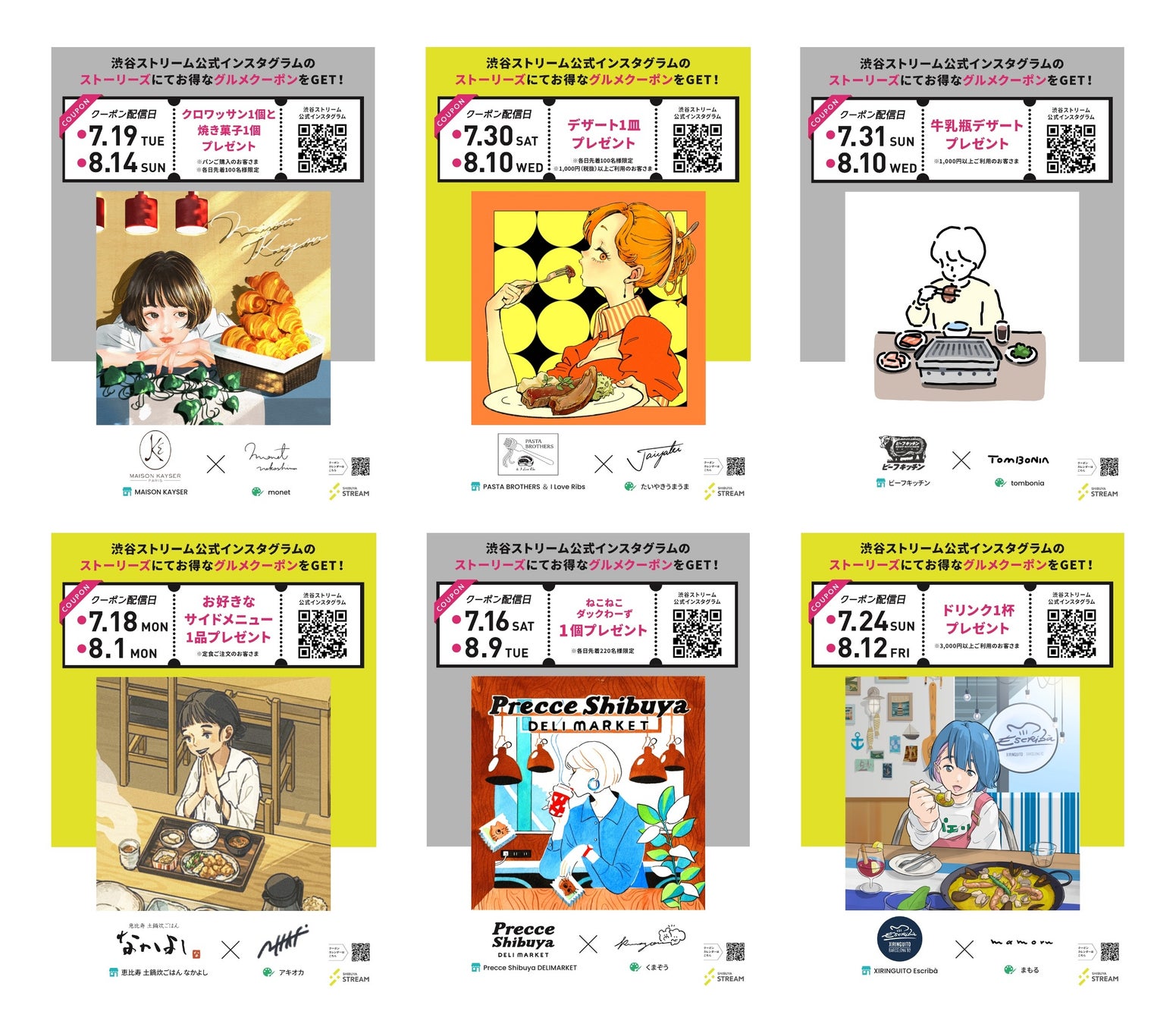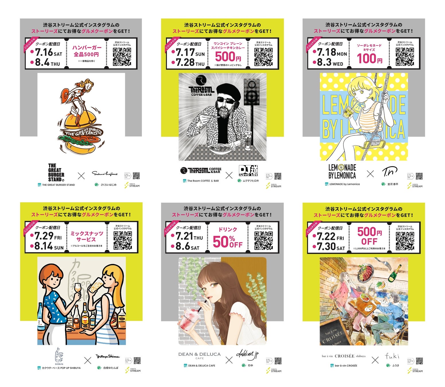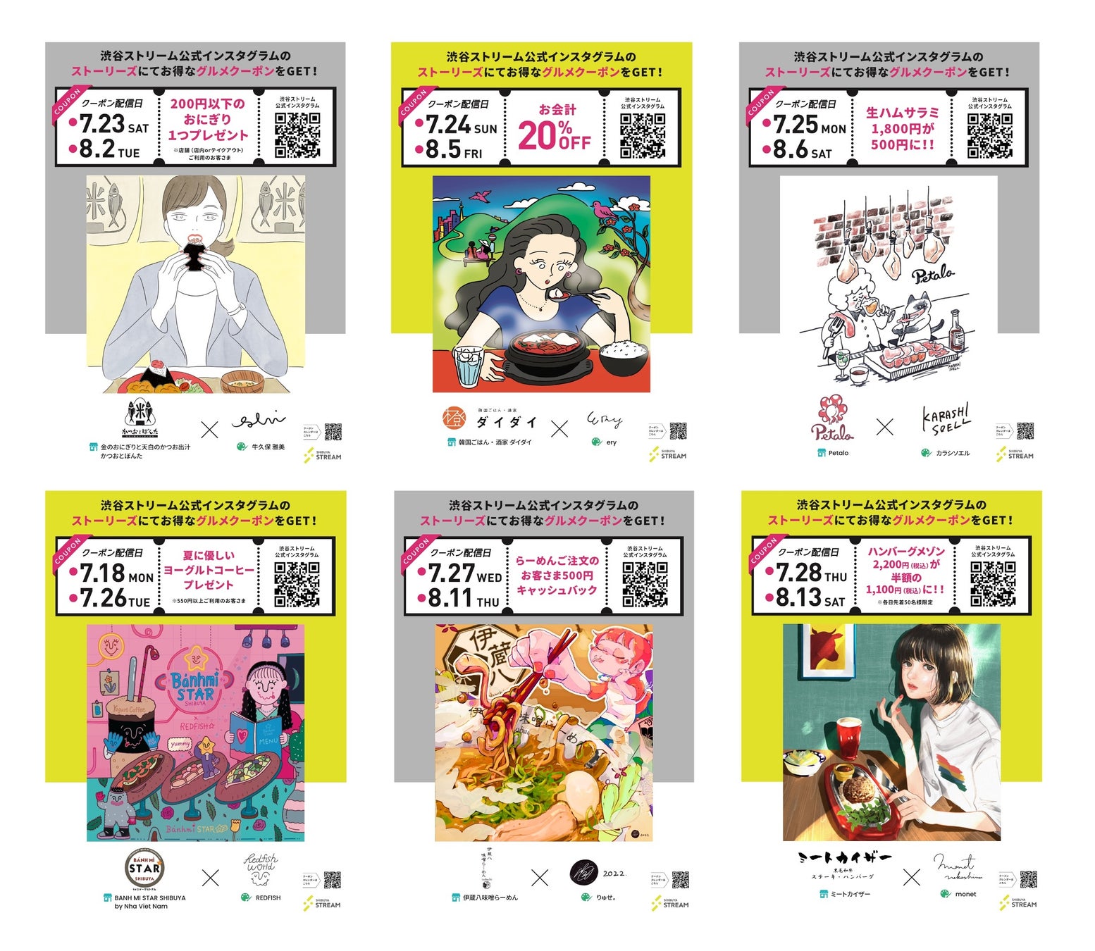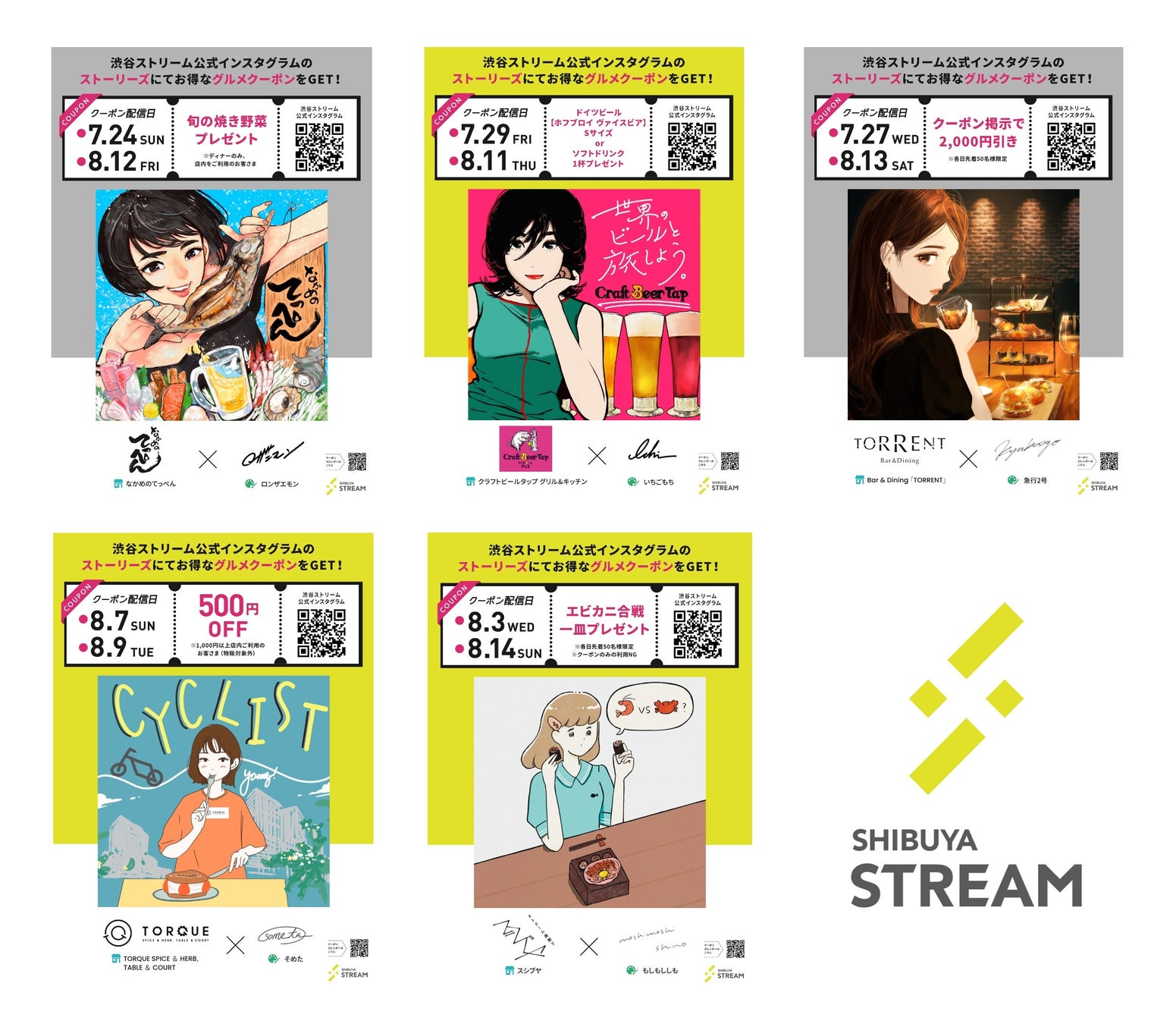 2022年7月16日(土)から8月14日(日)の期間、人気イラストレーター28人が描く、渋谷ストリーム内飲食店舗をイメージしたイラストとともに、毎日日替わりのグルメクーポンを配信します。渋谷ストリーム公式Instagramをフォローして、ストーリーズをお店で提示するだけで、館内の飲食店をお得にご利用いただけます。