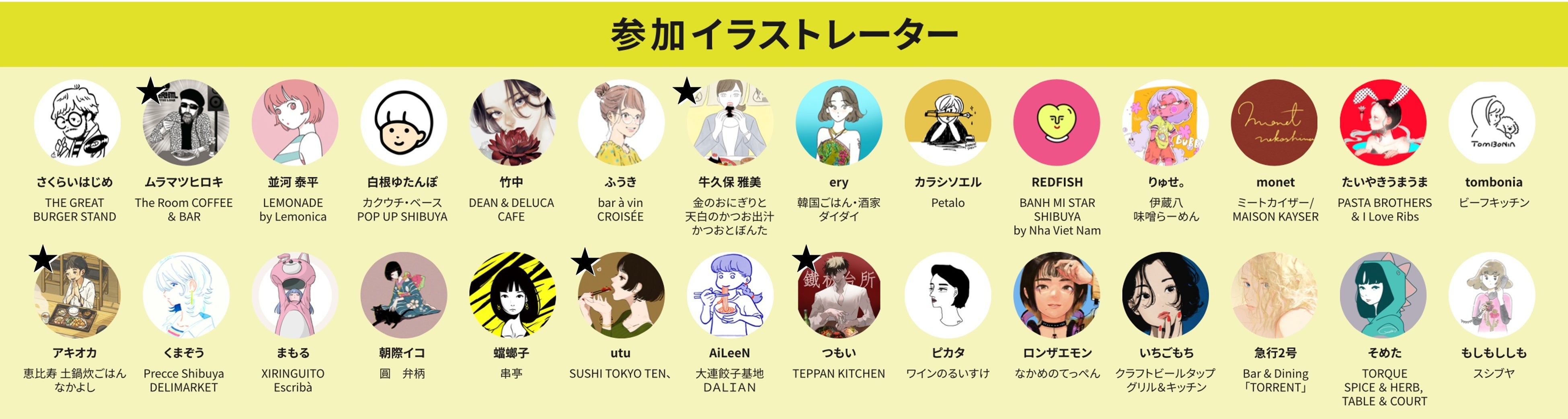 <参加アーティスト> ★:日替わりイラストグルメクーポンのみ参加