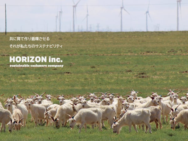 ホリゾンは内モンゴルの草原に自社牧場を持ち牧民と共にカシミヤ山羊を育て、自社工場での一貫生産でトレーサビリティのあるカシミヤのマフラーやストール、ニット、ブランケット、毛布などを作っています。