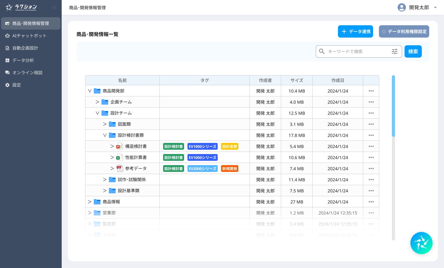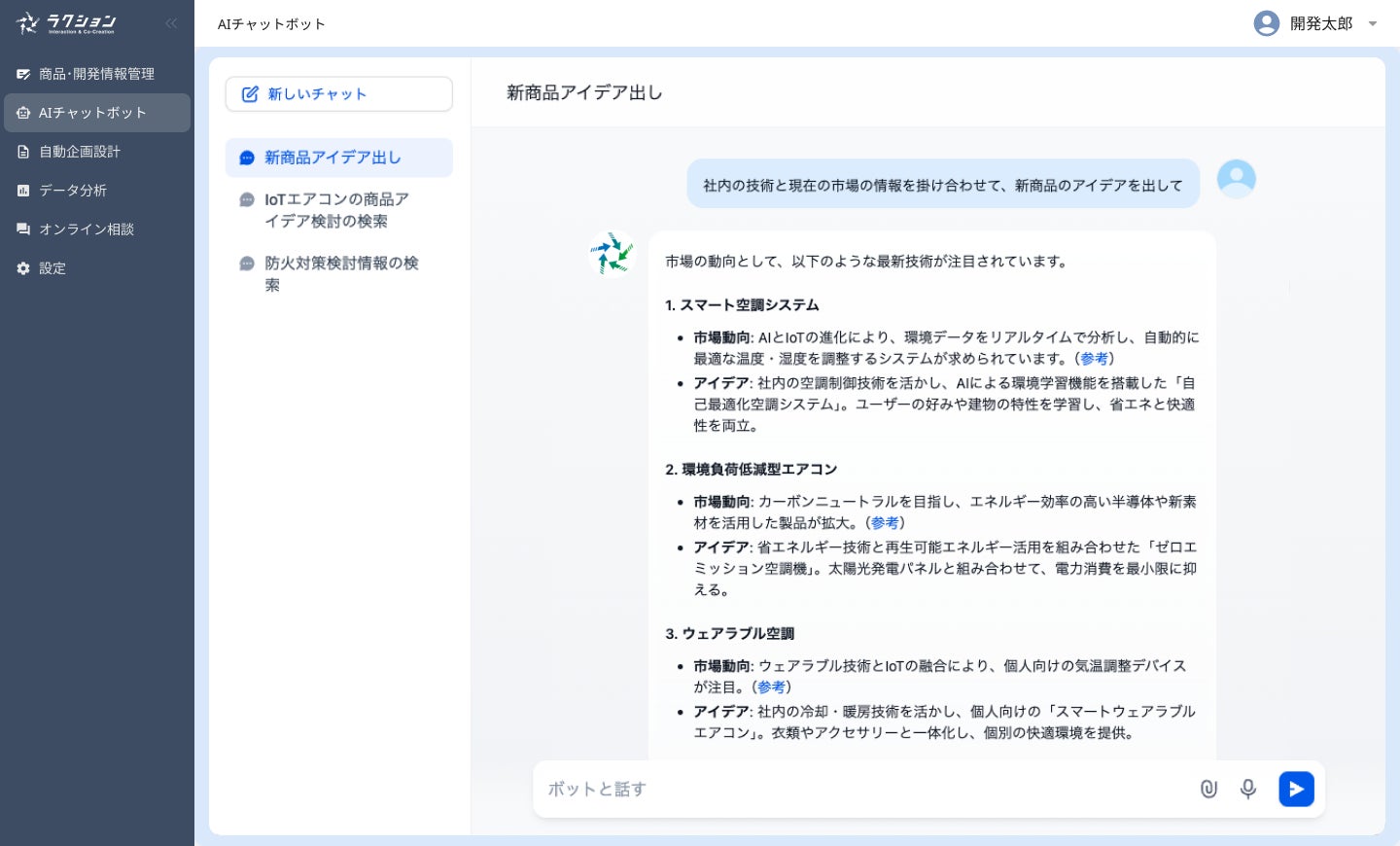 社内の技術・データを学習し、社外の情報検索にも対応したAIが、社内外の情報を掛け合わせて新商品のアイデア出しや企画・設計書類の作成を自動で行います。