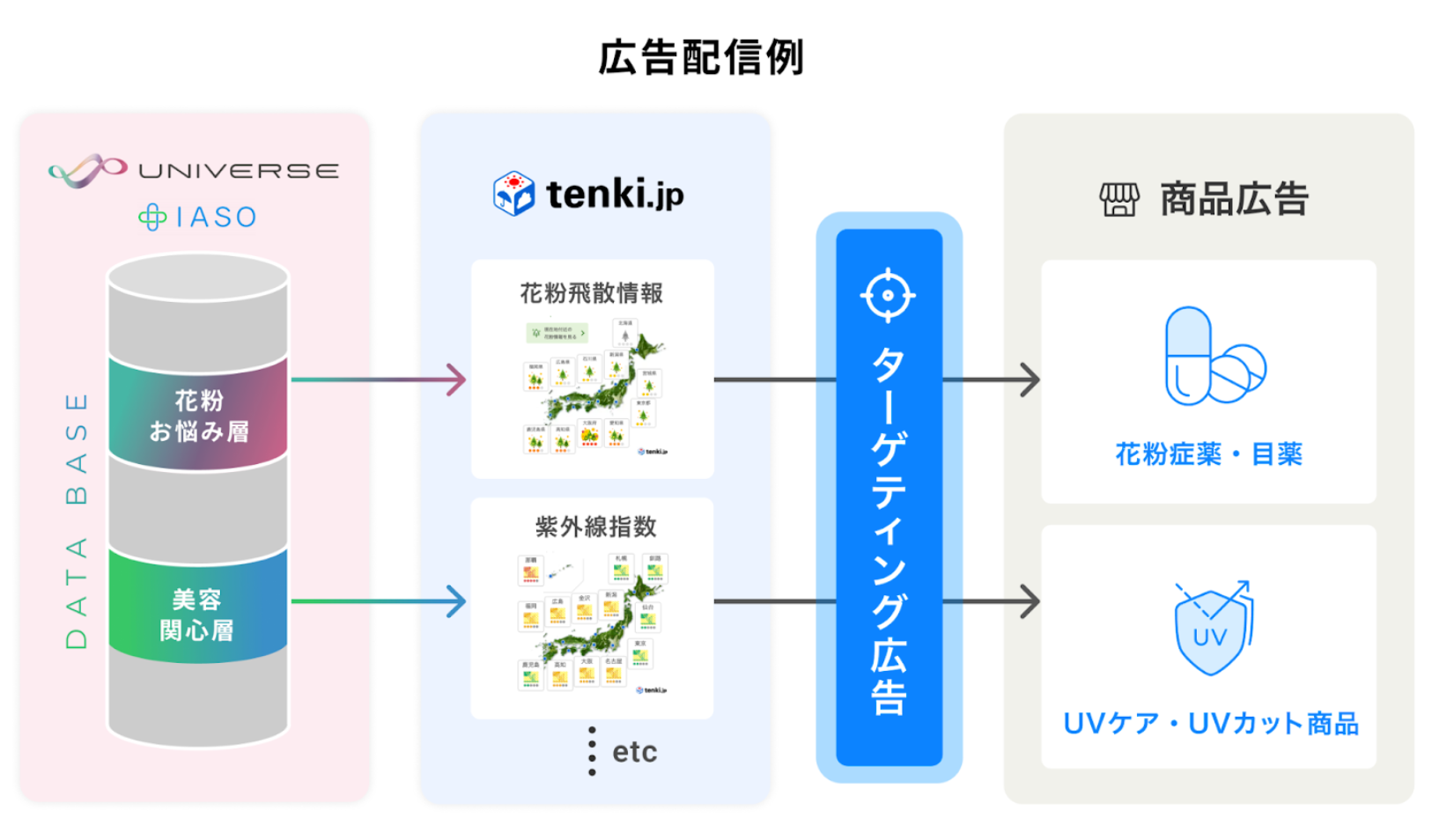 マイクロアドは、膨大な消費行動データを集約したデータプラットフォーム「UNIVERSE」を軸に、様々な業界業種に特化したマーケティングプロダクトを提供しております。また、「UNIVERSE」のデータを活用した医療・製薬業界向けのマーケティングプロダクトとして「IASO」を提供しております。この提携では、広告主の訴求内容に対し「tenki.jp」の指数情報と、「IASO」が推定する特定の症状に悩みを抱える層を指定し掛け合わせた、親和性のあるユーザーを捉えるターゲティング広告配信を実現します。また「tenki.jp」では「UNIVERSE」のセグメントデータを活用し、独自の広告配信が可能となります。