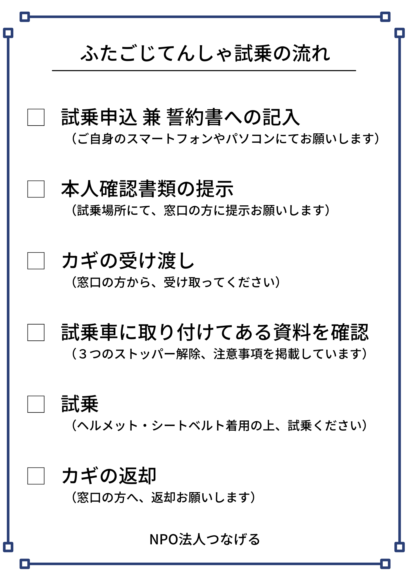 事前にNPO法人つなげるが運営する『尼崎ふたごLINE』にお問い合わせください。尼崎市での試乗となりますが、市外の方からも問い合わせ受け付けています。LINE内で、本人確認および試乗申込兼制約フォームへの記入をしていただき、試乗当日に武庫西生涯学習(ゆうやけ)プラザの窓口の方にお声がけいただき、試乗の旨をお伝えください。(尼崎ふたごLINEの登録URLはこちら -> https://lin.ee/5b7HPxs )