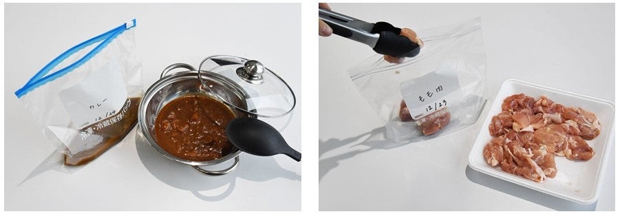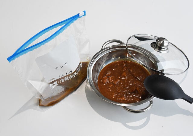 広いマチ付きで、立てて置くことができるジッパーバッグです。バッグを手で抑えなくても自立するので、カレーやスープなどの汁物を移し替える際や電子レンジで解凍する際にも便利です。またマチが広いので丸いものやかさばるもの、日用品の収納などにも大活躍します。簡単に開閉ができるスライド式ジッパータイプの「自立式がいい!スライド式がいい!ジッパーバッグ」と汁物も安心なダブルジッパータイプの「立派に自立するダブルジッパーバッグ」の2種類です。どちらも日付や内容物を書き込めるスペースがあり、冷蔵・冷凍保存や電子レンジでの解凍も可能です。
