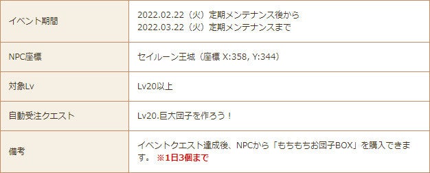「お菓子作りの天才・マルタ」が、世界一の巨大団子を作ろうと張り切っています。けれどあまりの巨大さに一人で作れず、手伝いを募集しています。巨大団子作りを手伝ってあげましょう。マルタから依頼されるクエストをクリアすると「もちもちお団子BOX」を受け取ることができます。もちもちお団子BOXからはエフェクトアイテム「もちもちお団子」や冒険に役立つアイテムが一定の確率で獲得できます。