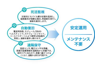 電波状態による通信エラーなどを防ぐため、定時リセット設定や死活監視など、自己復帰が可能な機能「ASC(Autonomous Stable Connection)」を搭載し、無人環境下でも安定運用が可能です。