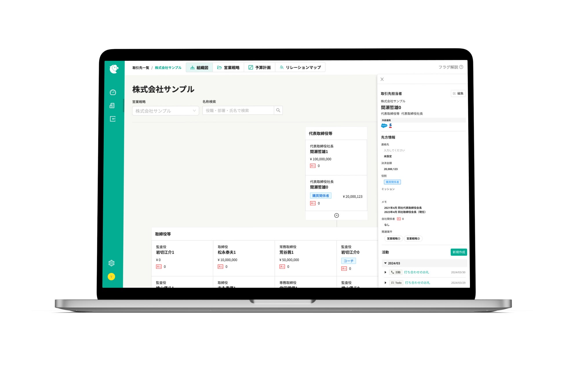 会うべき重要なキーマンの特定と直近の接点状況の可視化、ミッシングピース*の可視化を通じて更に高度な営業戦略策定に貢献します。