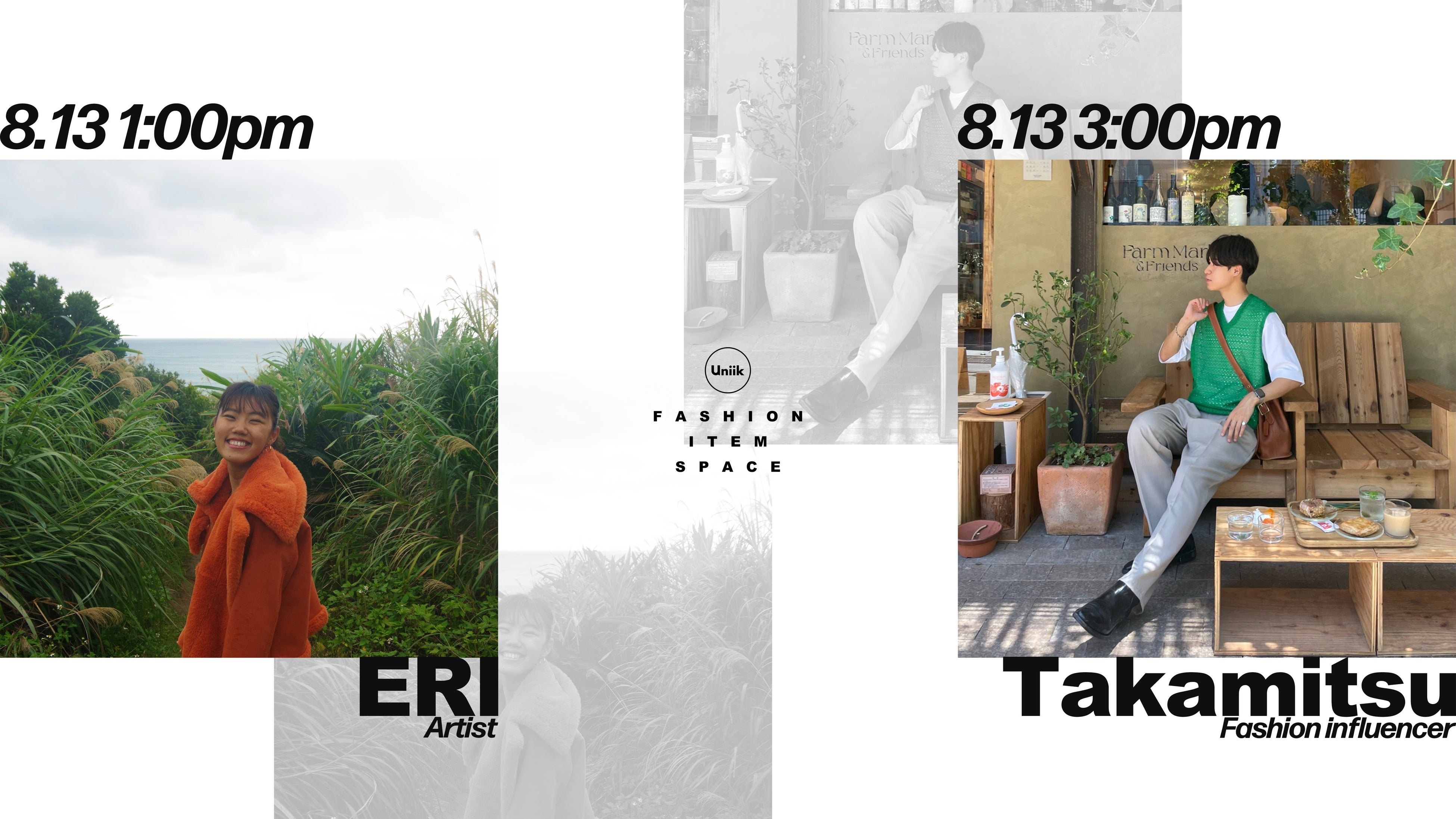 また、同じく初日(8月13日)15時よりインスタグラムで2.8万人のフォロワーを持つ、人気大学生ファッションインフルエンサー兼ブランドディレクターとして活躍中のTakamitsuさん(https://m.uniik.me/user/207900552158311215)による写真撮影のコツや、投稿に対するこだわりなどを含めたトークセッションを開催!