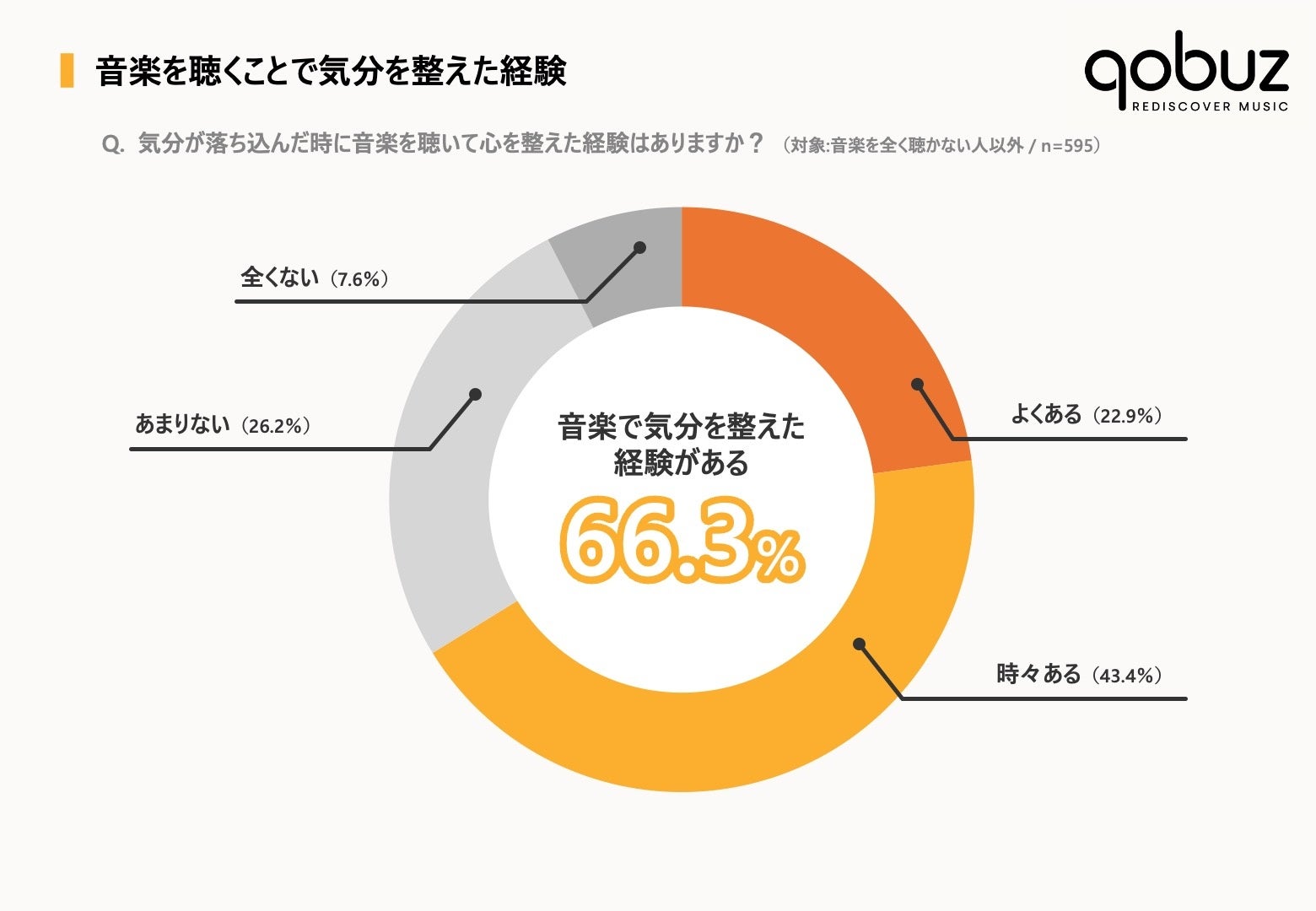 66.3%の人が「気分が落ち込んだ時に音楽を聴いて心を整えたことがある」と回答し、音楽が精神的健康維持に重要な役割を果たしていることがうかがえる。