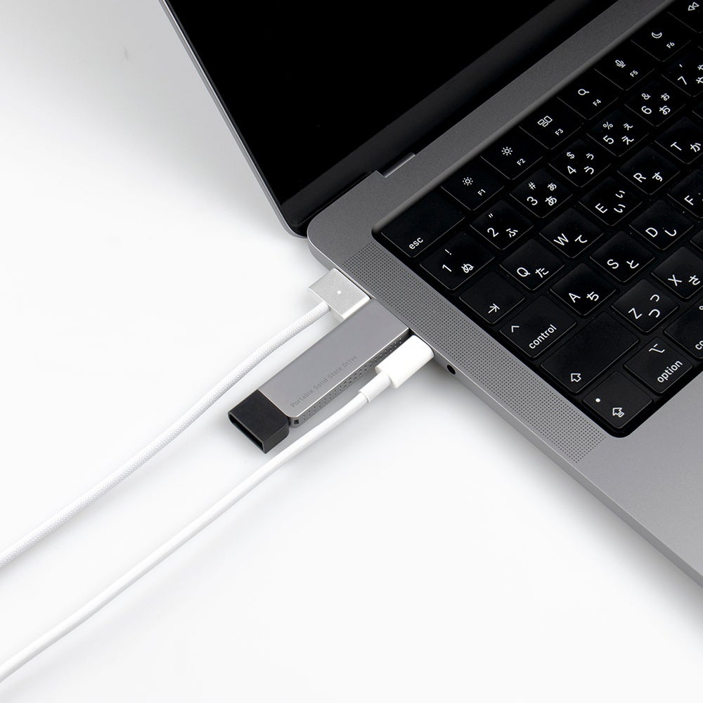 隣のポートにケーブルを接続しても、引っかかることなく同時に使用が可能です。隣のUSBポート同士の間隔が狭いMacBookProでもUSB-C™ポートをふさがず、充電しながら使用可能です。