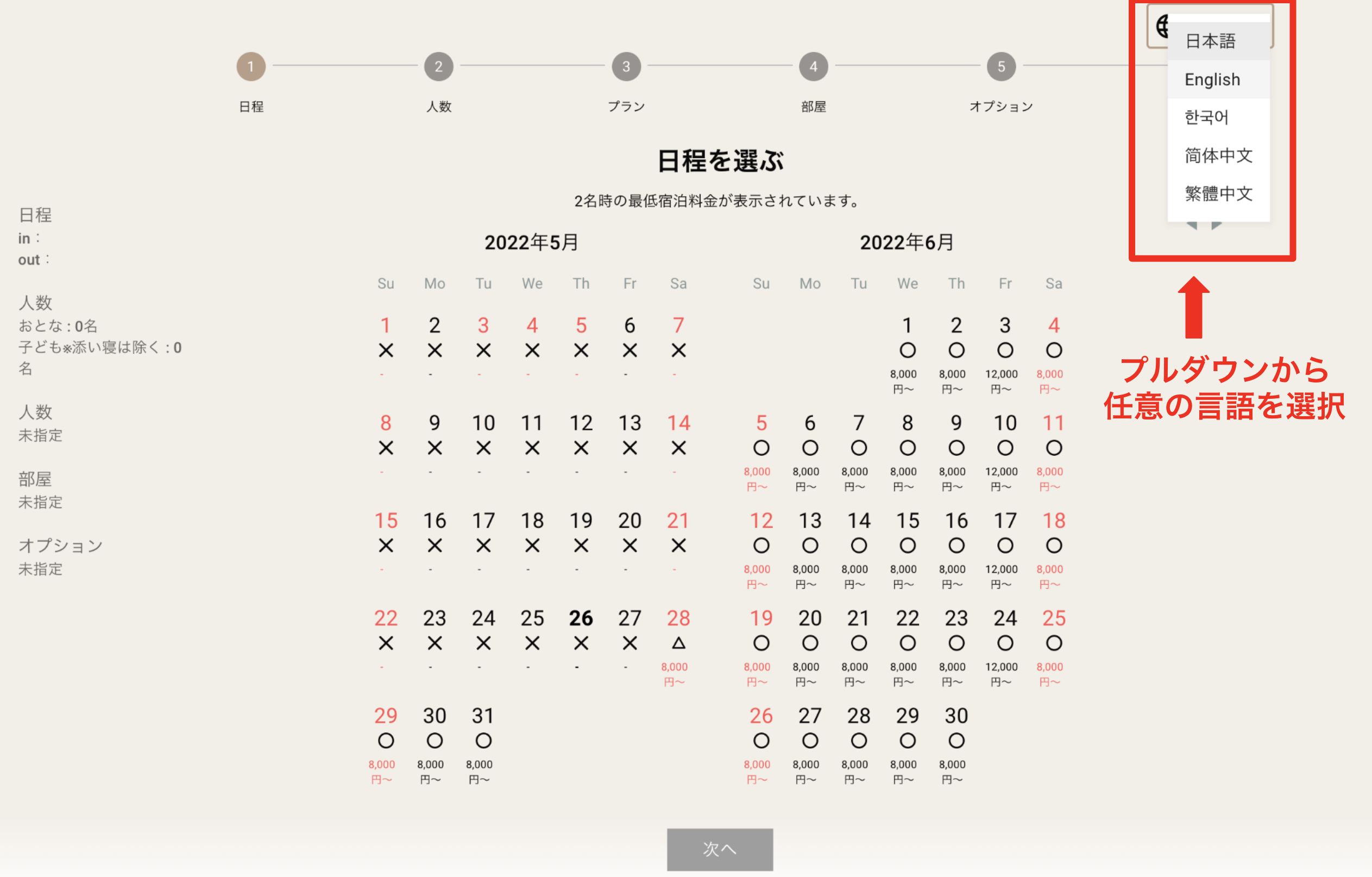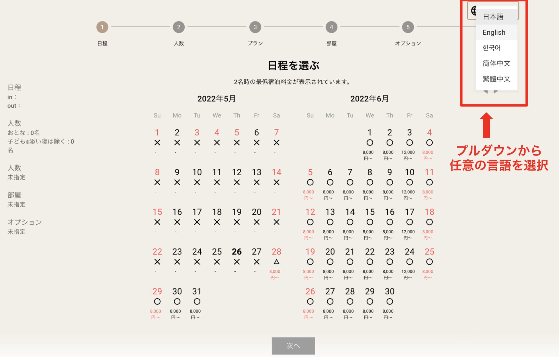 予約画面右上にあるプルダウンから、任意の言語を選択するだけで、画面上に表示される全ての文章が該当の言語へと自動翻訳されます。