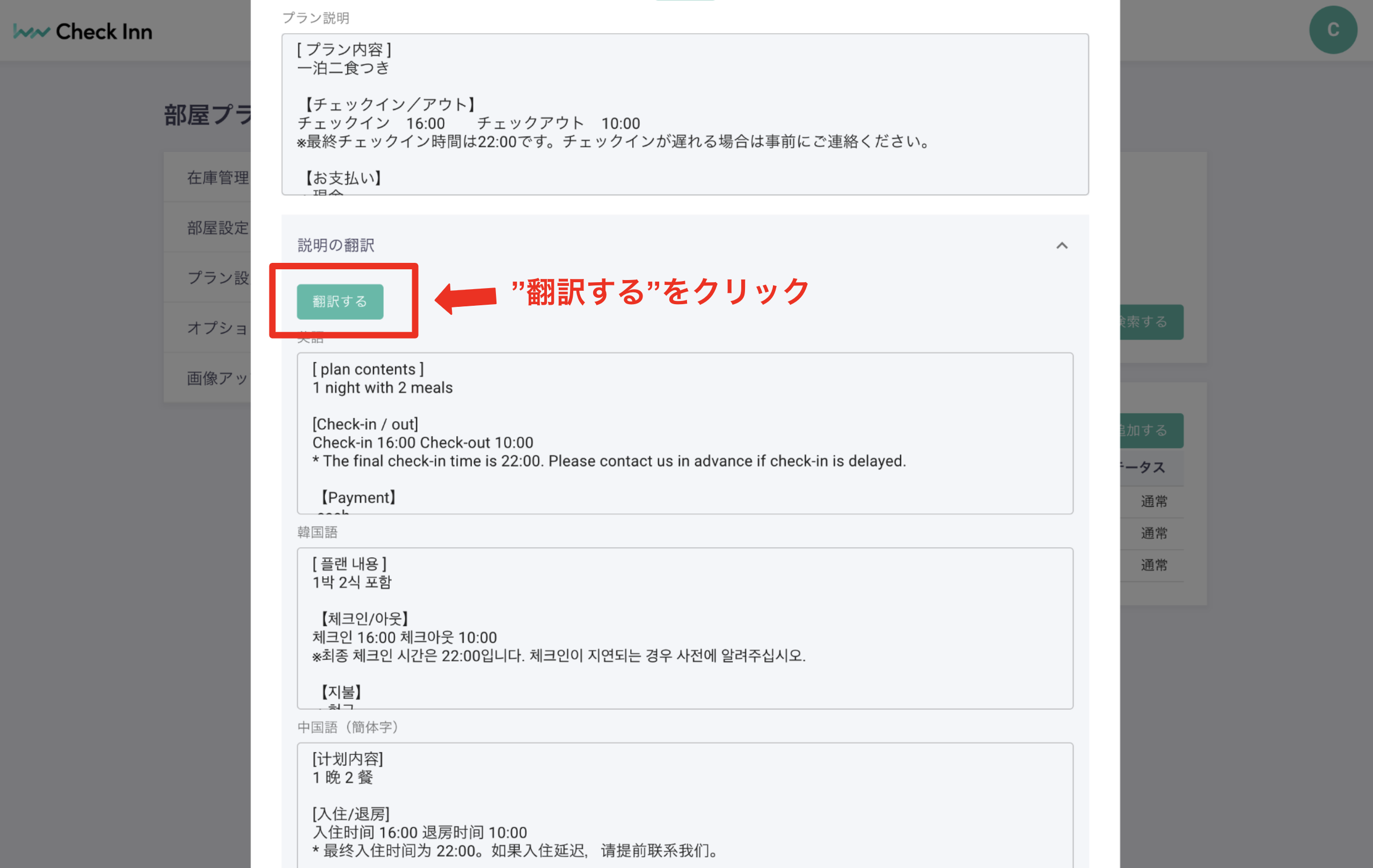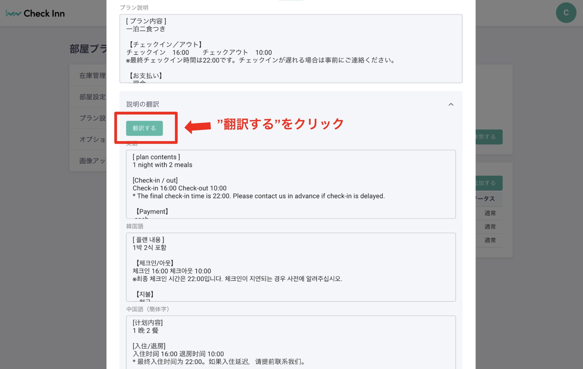 Check Innの管理画面にて、 お部屋説明・プラン説明など施設様にて入力した対象部分へ進みます。