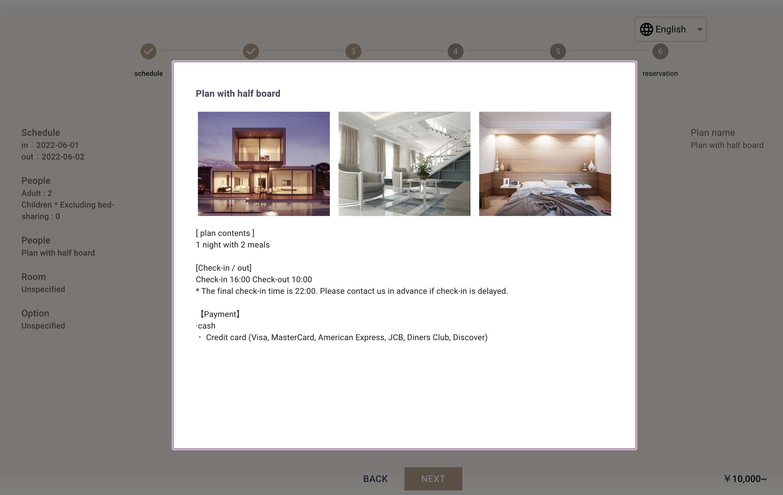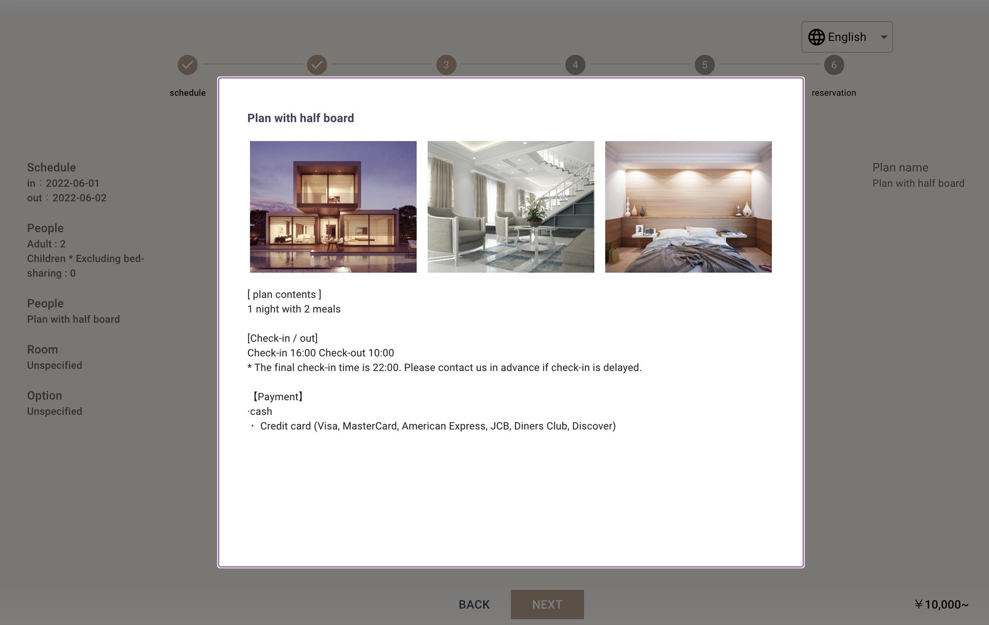 Check Inn Bookingにて多言語表示が可能となりました。これにより、来たるアフターコロナの訪日外国人旅行者の宿泊予約にも対応が可能となりました。予約画面から任意の言語を選択するだけで、各言語に自動で翻訳されたプランやお部屋が表示されます。