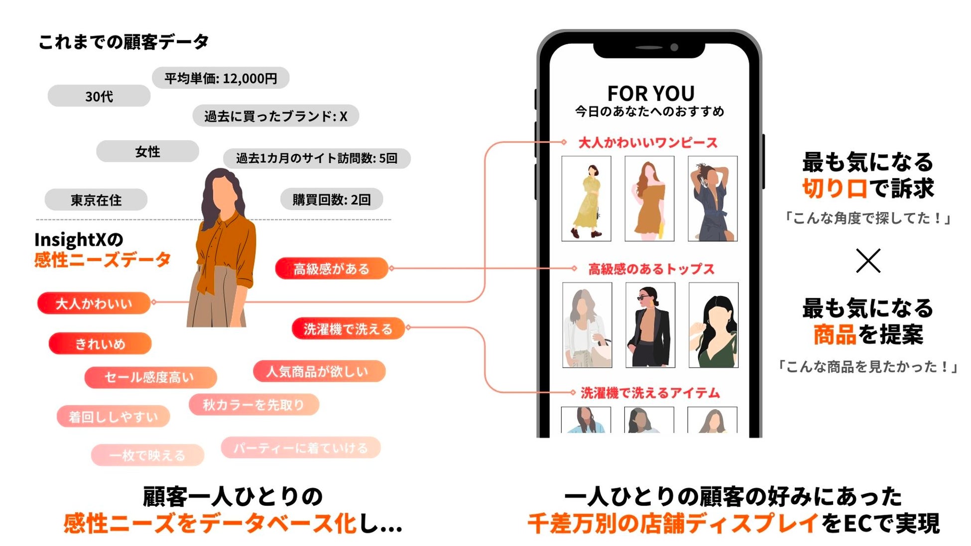 「InsightX」は、自社ECを運営するBtoC企業向けに、ECを訪問する顧客一人ひとりの「感性ニーズ」をデータベース化し、様々な顧客接点で一人ひとりの気持ちに寄り添う体験を創出するAI SaaSです。