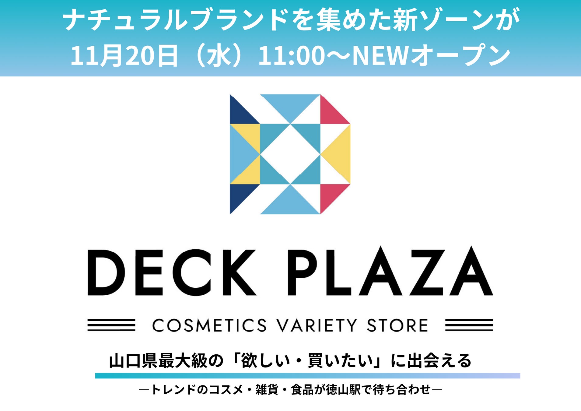 ナチュラルブランドゾーンのオープンにより山口県最大級のバラエティショップが実現することが可能となり、「欲しい」「買いたい」~トレンドのコスメ・雑貨・食品が徳山駅前で待ち合わせ~をコンセプトの『DECKPLAZA』と共に新たな枠組みで地域の未来を創ることを考えていきます。