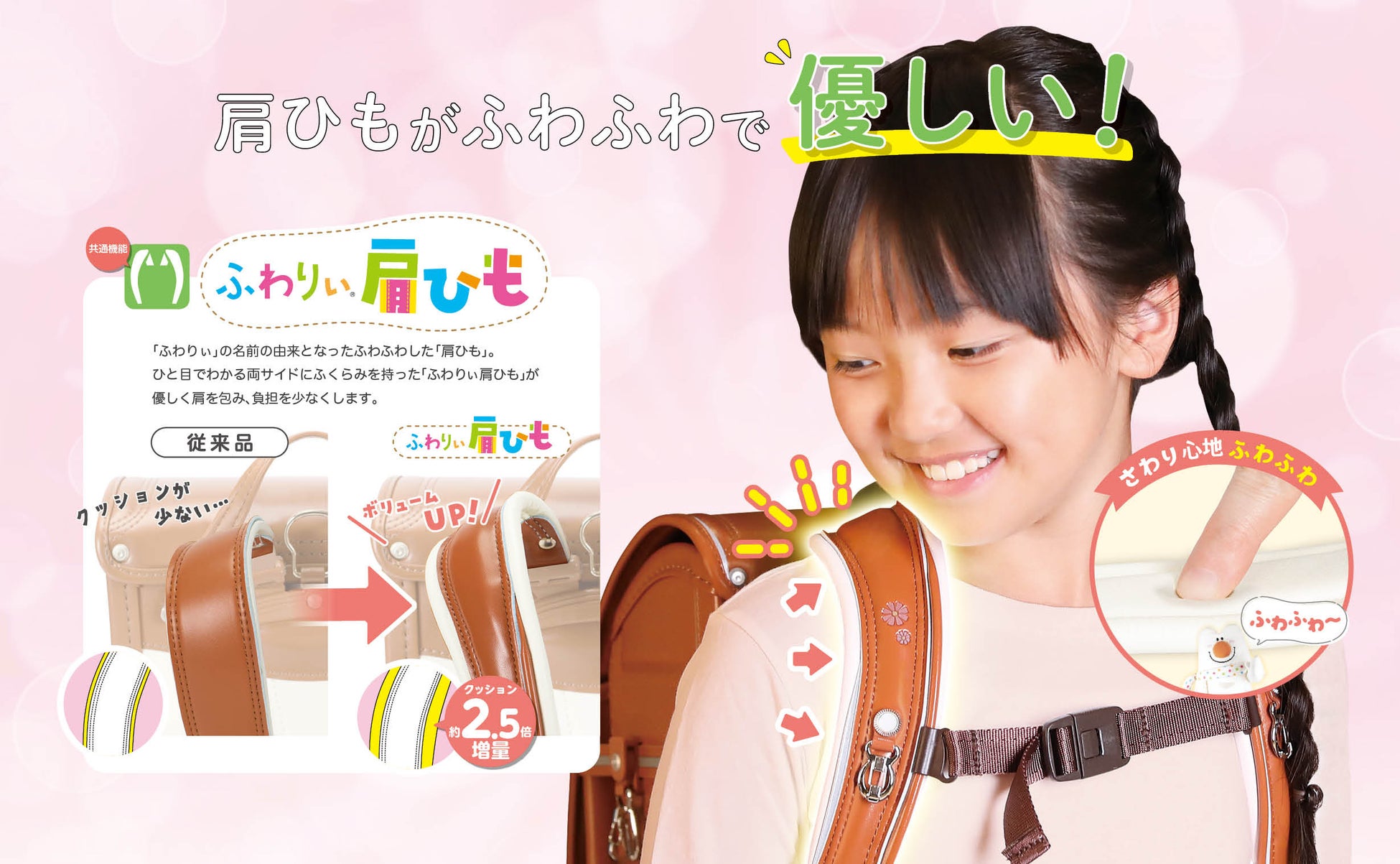 ひと目で「ふわりぃのランドセルだ!」と分かる特徴的な両サイドのふくらみを持った「ふわりぃ肩ひも」が優しく肩を包みます。
