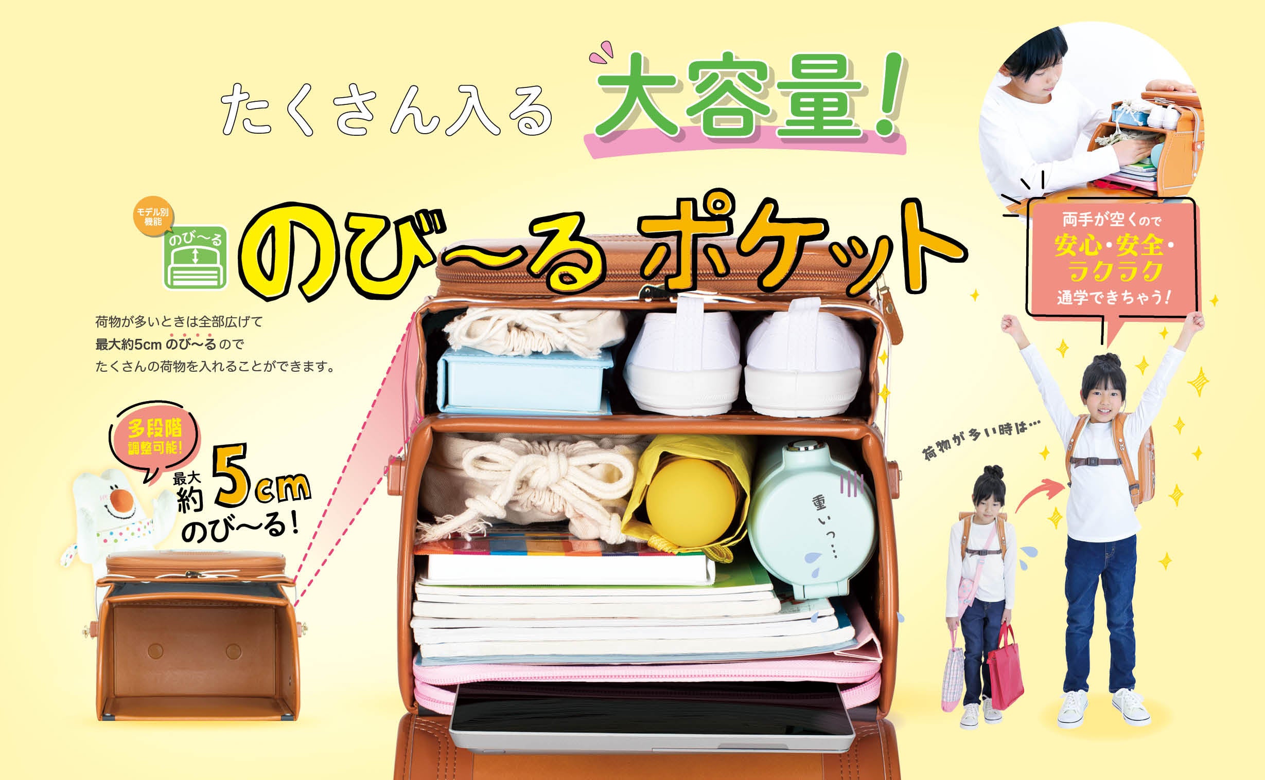 荷物が多いときは全部広げて、たくさんの荷物を入れることができます。両手が空くので、安心・安全・らくらく通学ができます。