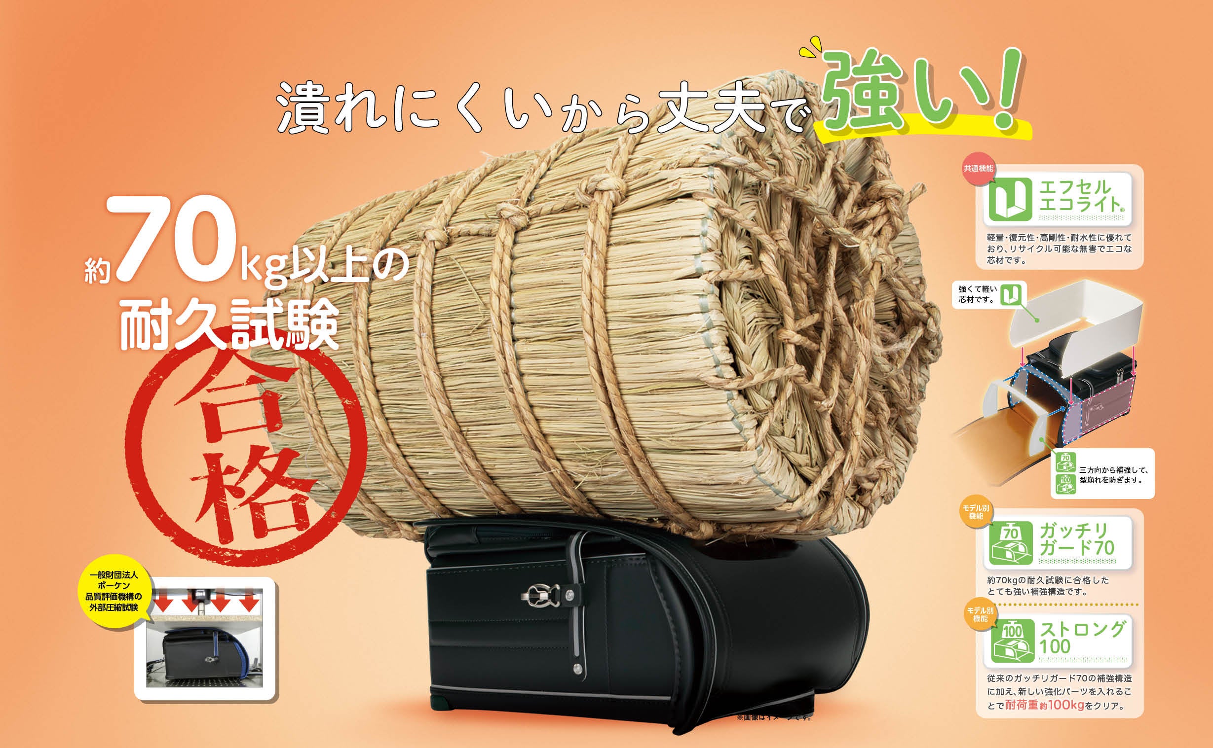 潰れにくいから丈夫で強い!軽くて強い「エフセルエコライト」と三方向補強 の「ガッチリガード」で型崩れを防ぎます。