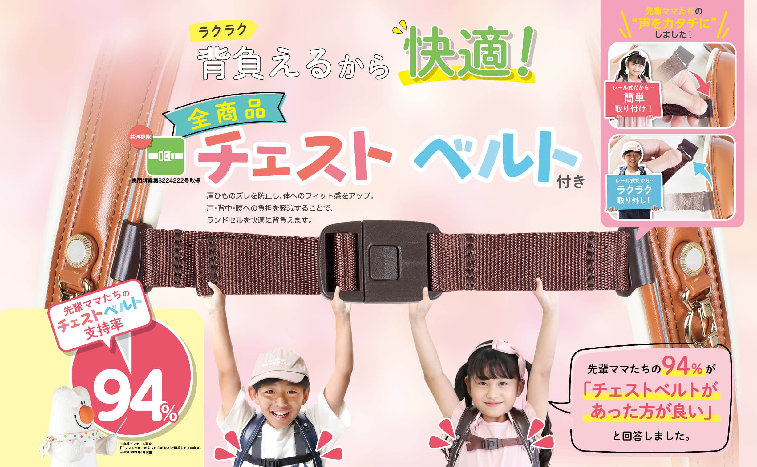 ふわりぃランドセルならではの特徴的な機能である「チェストベルト」は、全商品に標準装備されています。