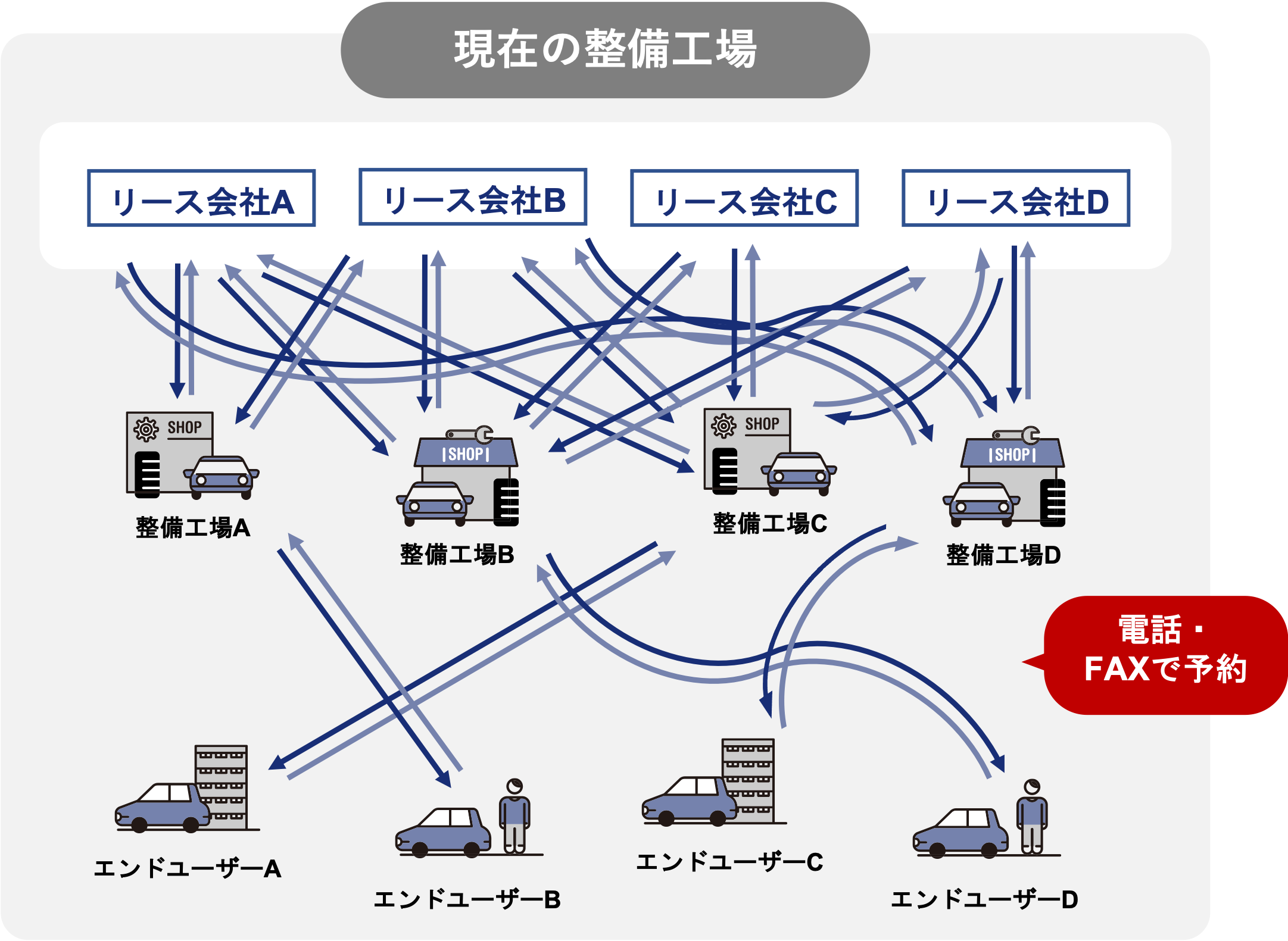 自動車リース業界では、車両を企業や個人に長期間賃貸し、併せて車検、修理・点検など、車両維持管理業務にも対応しています。整備工場では、複数のリース会社のメンテナンスを請け負っているケースが多く、各リース会社固有のシステムと連携せざるを得ない事に加え、電話やFAXでのメンテナンス依頼も多く、複雑な受注体制となっており、深刻な人材不足も重なり、現場業務が非常にひっ迫している状態となっております。その為、自動車リース業界にとっても近年、リース車両のメンテナンスを担う整備工場ネットワークの維持が困難となるケースもあり、このような課題を解決し効率化を推進することは、自動車リース業界・自動車整備業界双方にとって長年の悲願でもありました。