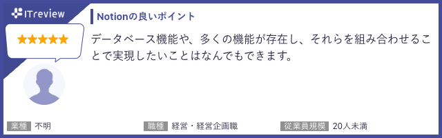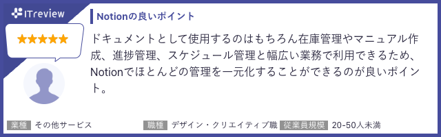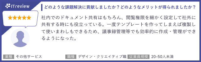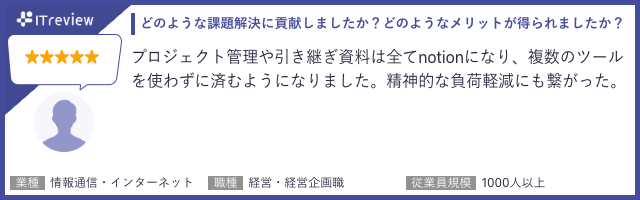 レビュアーの皆様からは「多くの機能が存在し、それらを組み合わせることで実現したいことはなんでもできる」「幅広い業務で利用できるため、ほとんどの情報管理を一元化できる」など、Notionの特長でもある多機能性やカスタマイズ性などを高く評価いただきました。Notionの導入によって「タスク処理の生産性が向上し、抜け漏れがなくなった」「社内でのドキュメント共有はもちろん、閲覧権限を細かく設定して社外に共有する時にも役立っている」など、コラボレーションの促進に繋がっているという声も多くいただいています。