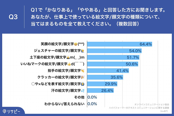 Q1で「かなりある」「ややある」と回答した方に、「Q3.あなたが、仕事上で使っている絵文字/顔文字の種類について、当てはまるものを全て教えてください。(複数回答)」(n=87)と質問したところ、「笑顔の絵文字/顔文字😃(^^)」が64.4%、「ジェスチャーの絵文字/顔文字🙋♂️」が54.0%、「土下座の絵文字/顔文字🙇♂️m(_ _)m」が51.7%という回答となりました。