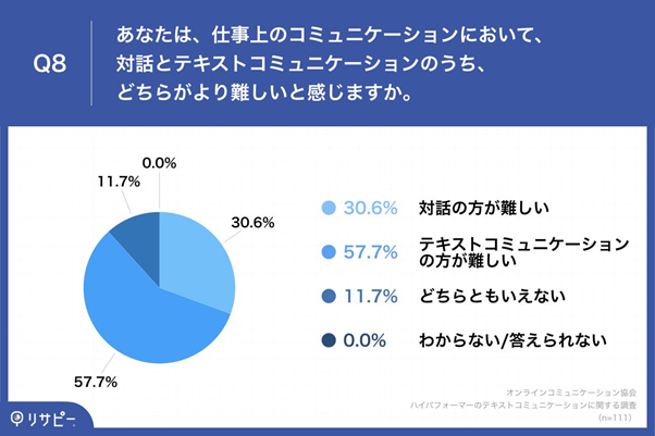 「Q8.あなたは、仕事上のコミュニケーションにおいて、対話とテキストコミュニケーションのうち、どちらがより難しいと感じますか。」(n=111)と質問したところ、「対話の方が難しい」が30.6%、「テキストコミュニケーションの方が難しい」が57.7%という回答となりました。