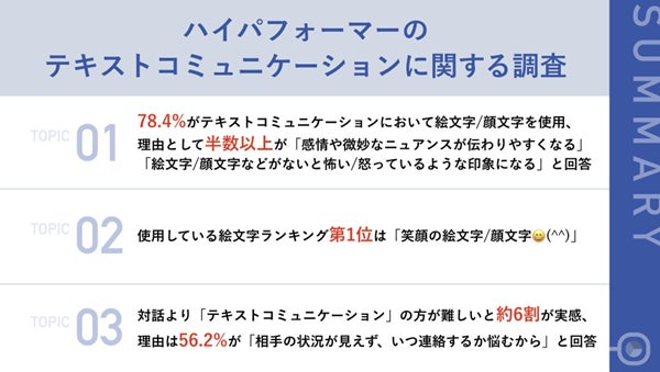 今回の調査からは現代のハイパフォーマーがチャットコミュニケーションにおいて絵文字を使っているという事実、そしてハイパフォーマーであってもテキストコミュニケーションに難しさを感じているということが明らかになりました。