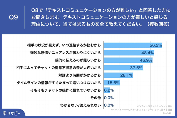 Q8で「テキストコミュニケーションの方が難しい」と回答した方に、「Q9.テキストコミュニケーションの方が難しいと感じる理由について、当てはまるものを全て教えてください。(複数回答)」(n=64)と質問したところ、「相手の状況が見えず、いつ連絡するか悩むから」が56.2%、「微妙な感情やニュアンスが伝わりにくいから」が48.4%、「端的に伝えるのが難しいから」が46.9%という回答となりました。