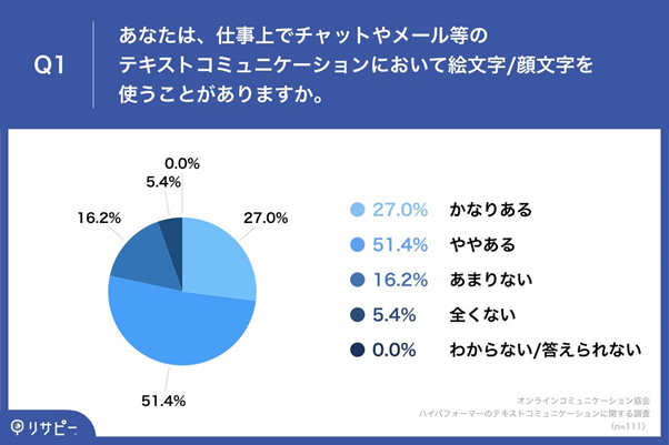 「Q1.あなたは、仕事上でチャットやメール等のテキストコミュニケーションにおいて絵文字/顔文字を使うことがありますか。」(n=111)と質問したところ、「かなりある」が27.0%、「ややある」が51.4%という回答となりました。