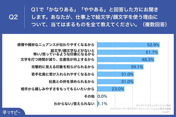 Q1で「かなりある」「ややある」と回答した方に、「Q2.あなたが、仕事上で絵文字/顔文字を使う理由について、当てはまるものを全て教えてください。(複数回答)」(n=87)と質問したところ、「感情や微妙なニュアンスが伝わりやすくなるから」が52.9%、「絵文字/顔文字などがないと怖い/怒っているような印象になるから」が51.7%、「文字を打つ時間が減り、生産性が向上するから」が48.3%という回答となりました。