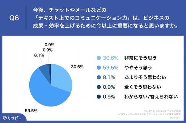 「Q6.今後、チャットやメールなどの「テキスト上でのコミュニケーション力」は、ビジネスの成果・効率を上げるために今以上に重要になると思いますか。」(n=111)と質問したところ、「非常にそう思う」が30.6%、「ややそう思う」が59.5%という回答となりました。
