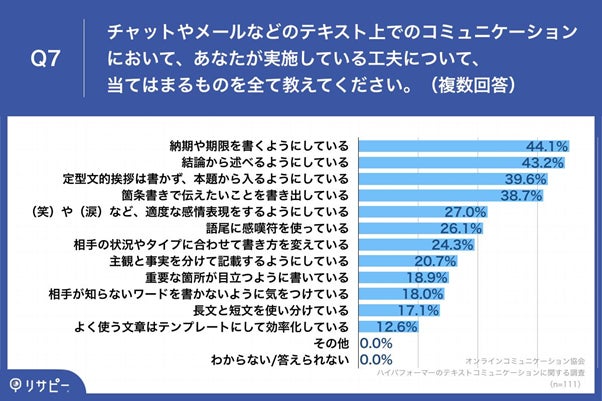 「Q7.チャットやメールなどのテキスト上でのコミュニケーションにおいて、あなたが実施している工夫について、当てはまるものを全て教えてください。(複数回答)」(n=111)と質問したところ、「納期や期限を書くようにしている」が44.1%、「結論から述べるようにしている」が43.2%、「定型文的挨拶は書かず、本題から入るようにしている」が39.6%という回答となりました。