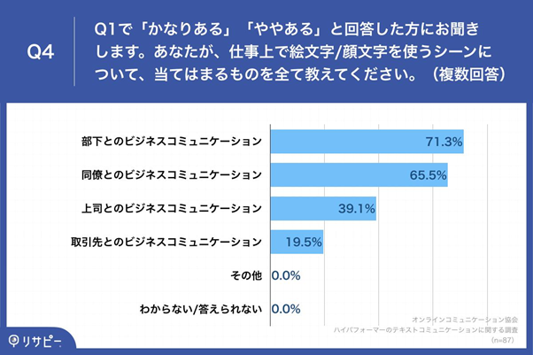 Q1で「かなりある」「ややある」と回答した方に、「Q4.あなたが、仕事上で絵文字/顔文字を使うシーンについて、当てはまるものを全て教えてください。(複数回答)」(n=87)と質問したところ、「部下とのビジネスコミュニケーション」が71.3%、「同僚とのビジネスコミュニケーション」が65.5%、「上司とのビジネスコミュニケーション」が39.1%という回答となりました。