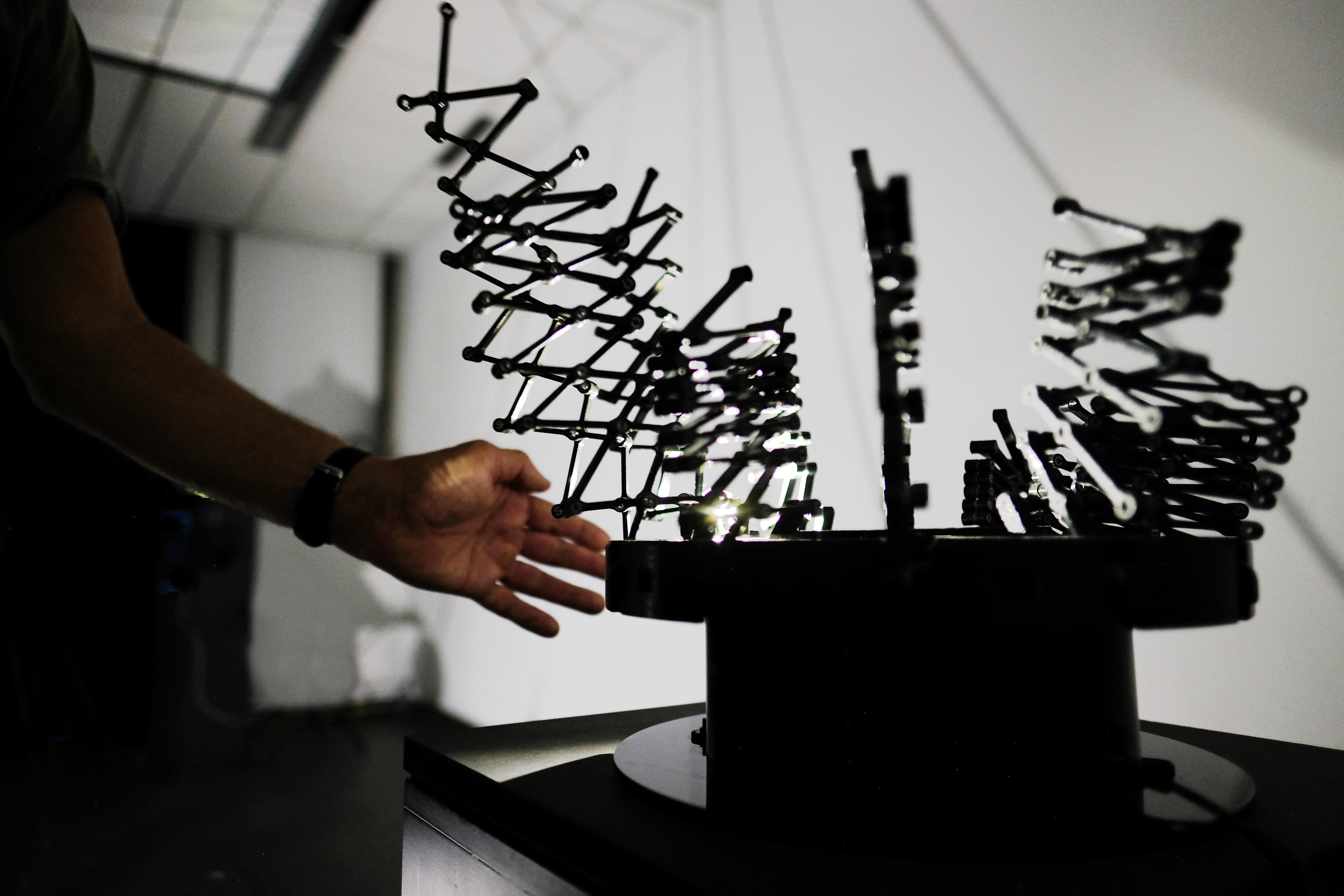 そこで、本研究では、「人の動きに合わせて空間自体を動的に変化させるロボット」など、従来の画面を超えて、物理的な空間に作用する新しいタイプのデジタルメディアやインターフェースを開発します。具体的には、天井に分散する群ロボットや、ダイナミックに変形するメカニカルな機構、および映像メディアと連動する3Dプリンタ技術などによって、スクリーンを飛び越え、立体的、空間的で物理的なインタラクティブメディアを開発します。そして、当社が保有するコンテンツ制作力や演出に関する知見を掛け合わせ、未来の日常空間と、そこに溶け込んだデジタルメディアのあり方を、ラディカルなプロトタイプで試作・思索していきます。