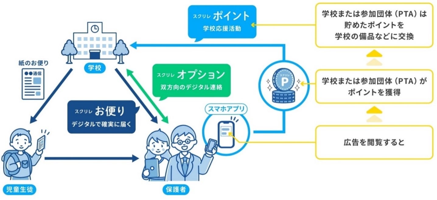 「スクリレ」は2021年4月に開始した、学校と保護者をつなぐデジタル連絡ツールです。「スクリレ」は保護者の個人情報を扱わず、保護者のスマートフォンに直接配信できる「スクリレお便り」、出欠連絡やアンケートができる「スクリレオプション」、広告で得た収益の一部を学校・PTAに還元する「スクリレポイント」の3つのサービスを提供しています。最大の特徴である「スクリレポイント」は、保護者が広告を任意に閲覧するだけで学校・PTAにポイントが貯まり、運動用具や書籍など、学校に必要な教育備品と交換できる仕組みです。アプリ上の広告は、公共の場にふさわしいかを運営者側で審査され、地域や学校区分、学年などに合わせた掲出が可能です。