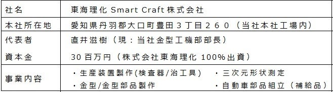 株式会社東海理化(本社:愛知県丹羽郡大口町 代表取締役社長:二之夕 裕美)は、2022年7月1日付にて、当社金型部門の主要機能(開発・設計・製作)を、当社完全子会社であり金型・機械設備などの生産機器を製作する理化精機株式会社へ統合し、同時に理化精機株式会社を社名変更し、新たに「東海理化Smart Craft株式会社」としてスタートすることを決定いたしました。社名である「Smart Craft」には、デジタルで繋がる工場「Smart Factory」にて、技術技巧「Craft」を兼備えたもの造りで金型事業へ挑戦していくという気概を表しています。