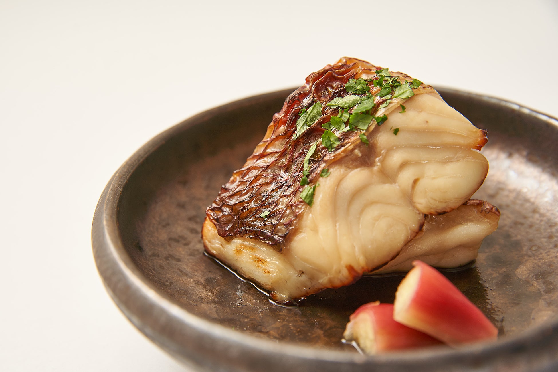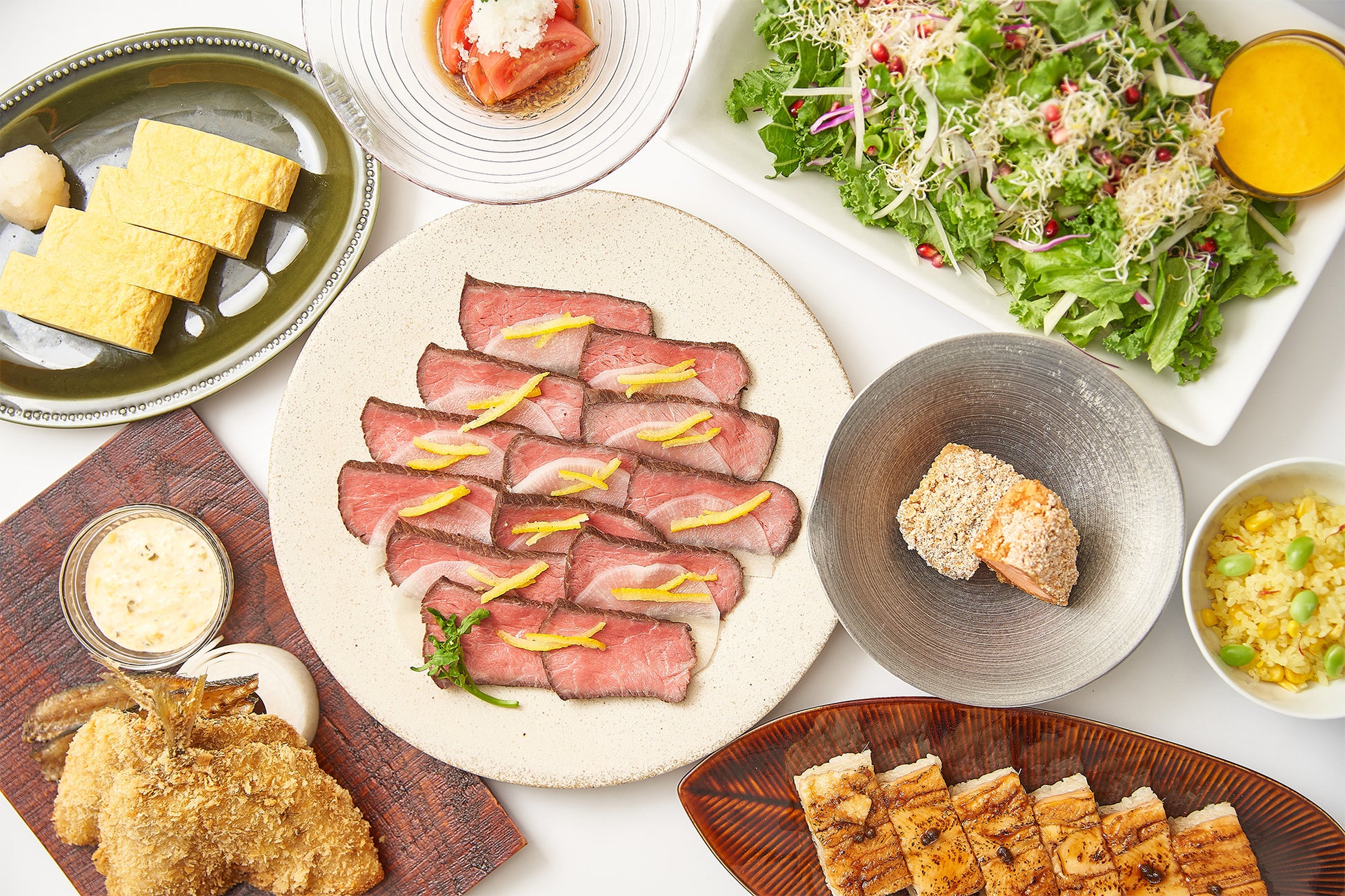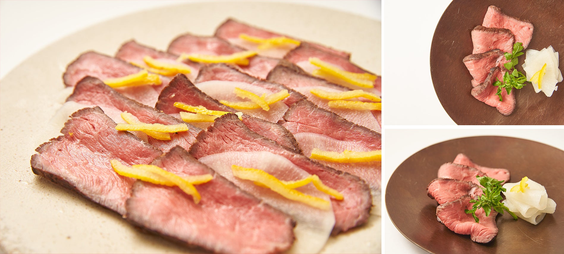 炭火で香ばしく焼き上げた黒毛和牛のローストビーフです。甘酢につけた千枚大根と柚子を添えてさっぱり風味豊かに仕上げたローストビーフを、千枚大根で巻いてお召し上がりください。夏場でしたら、めんつゆに大根おろしを入れて、冷たいそうめんと一緒にお召し上がるのもおすすめです。